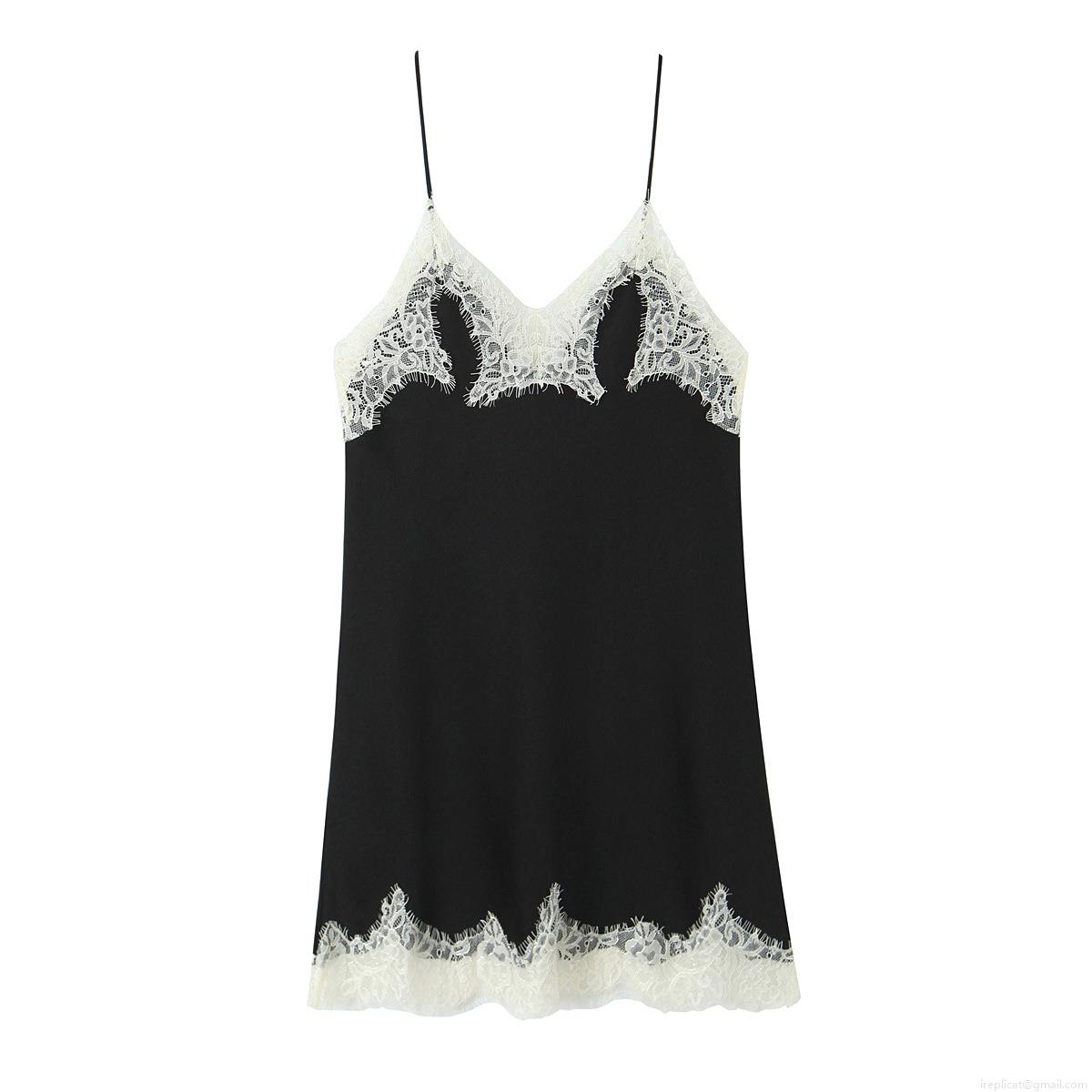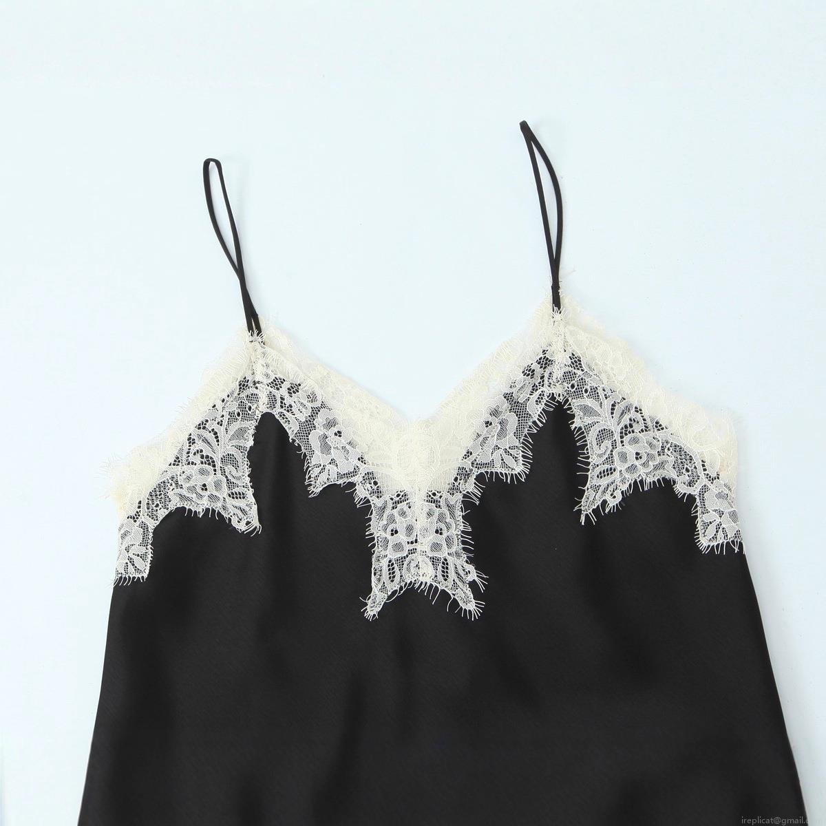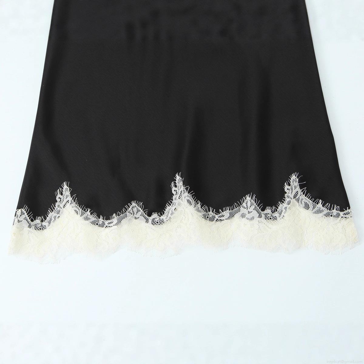 • Sexy Women Black Satin Slip Dress With White Eyelash Lace Patchwork V Neck Spaghetti Straps Mini A-Line Party Nightgown Dress