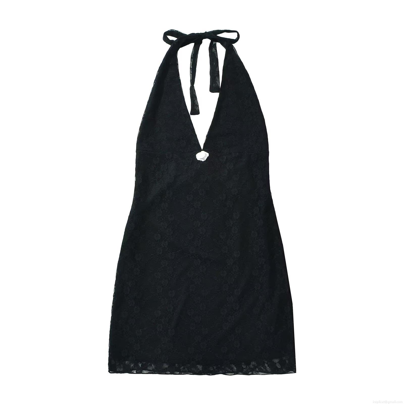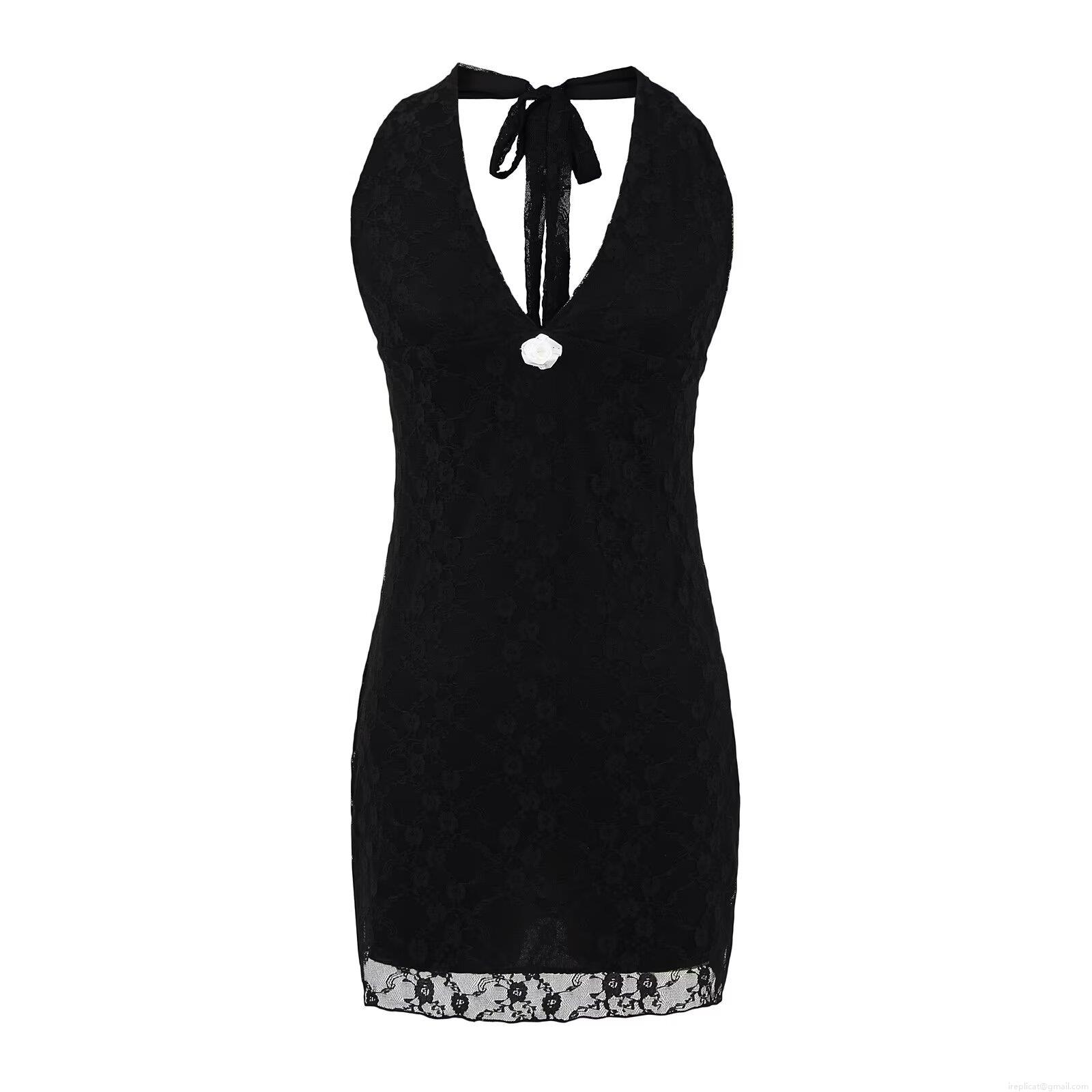• Sexy Women Lace Halter Backless Mini Dress Nylon Spandex Polyester Hollow Out Slim Fit Bodycon Party Dress With 3D Rose Flower Decoration
