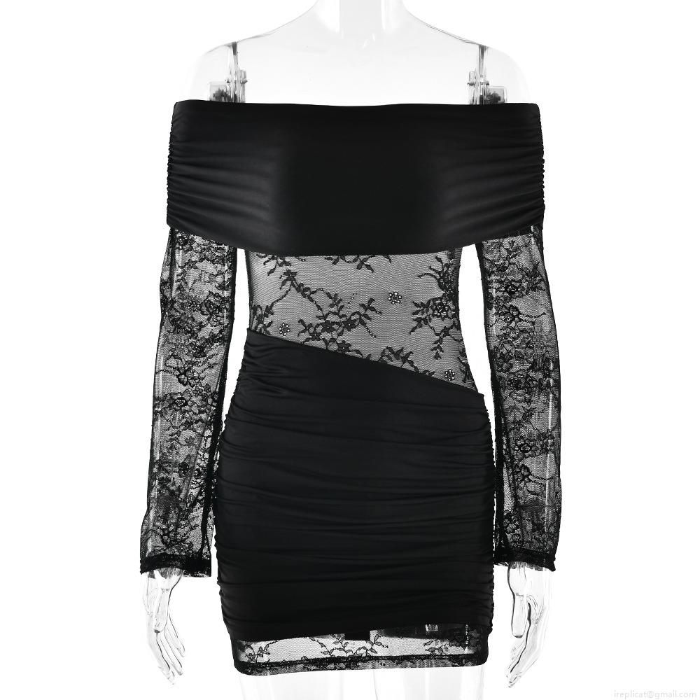 Sexy Women Off-Shoulder Lace Stitching Mini Dress Perspective Ruched Backless Bodycon Dress Long Sleeve Club Party Streetwear Slim Fit Dress