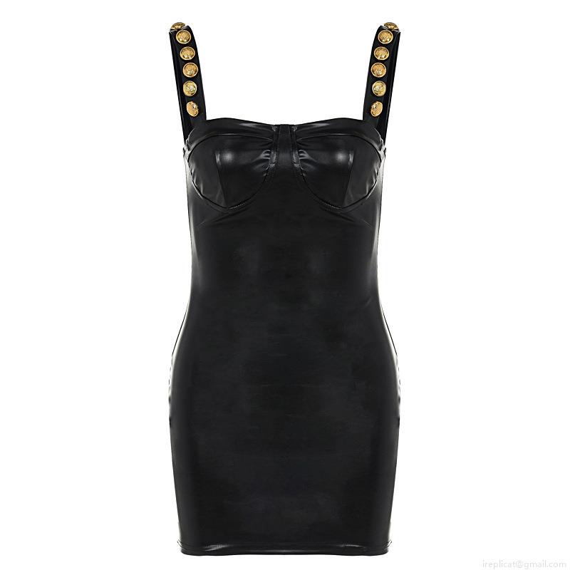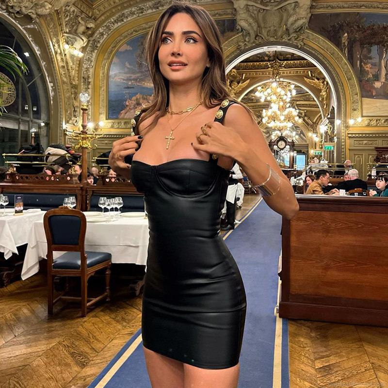 • Sexy Women PU Leather Bodycon Mini Dress With Gold Buttons Off-Shoulder Strapless Party Evening Dress Solid Black Autumn Winter Slim Fit Clubwear