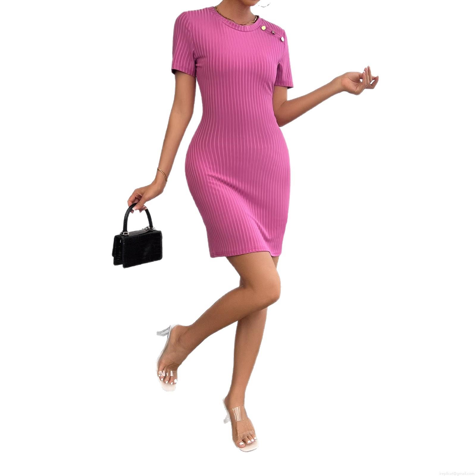 • Sexy Women Ripple Texture Bodycon Mini Dress Short Sleeve Round Neck With Metal Shoulder Buttons Slim Fit Polyester Blend Summer Elegant Party Dress