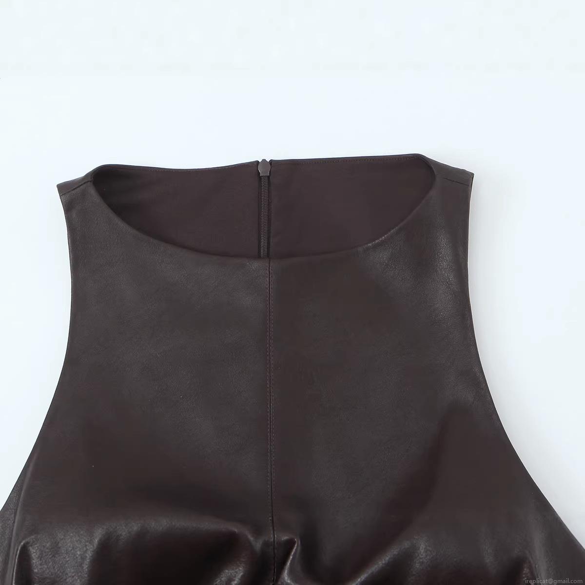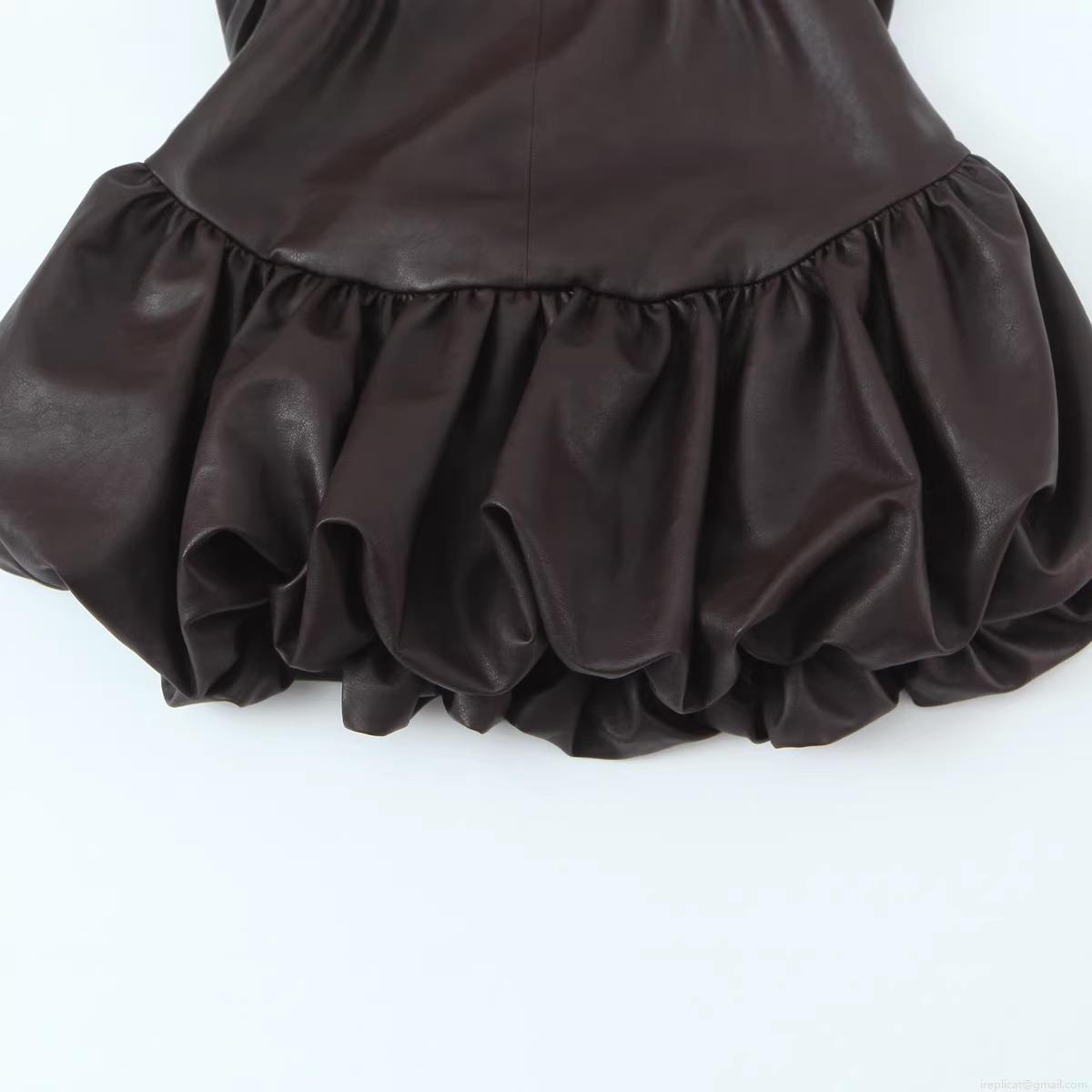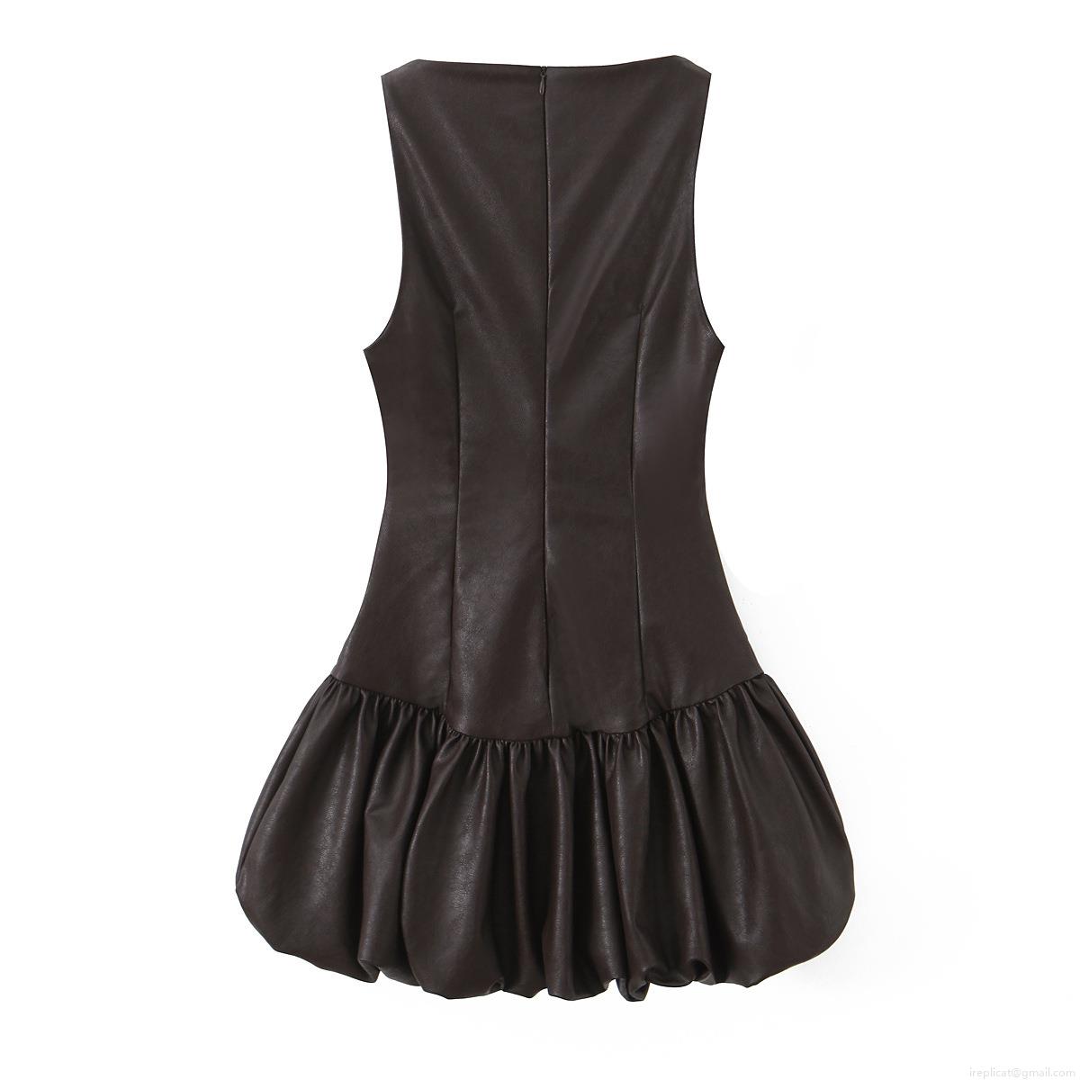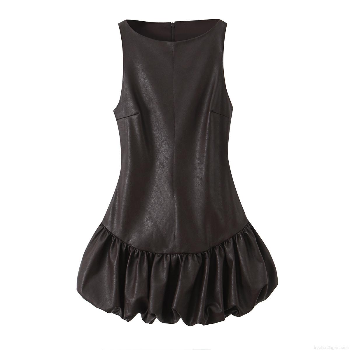 • Sexy Women Sleeveless PU Leather Puffy Mini Dress Round Neck High Waist Back Zipper Solid Color A-Line Silhouette Cocktail Party Clubwear Short Dress