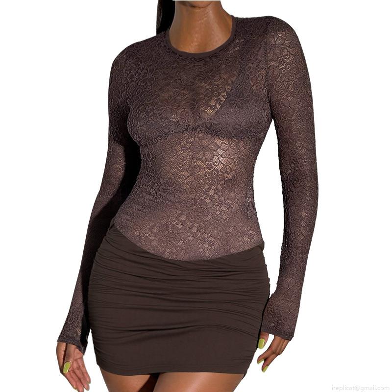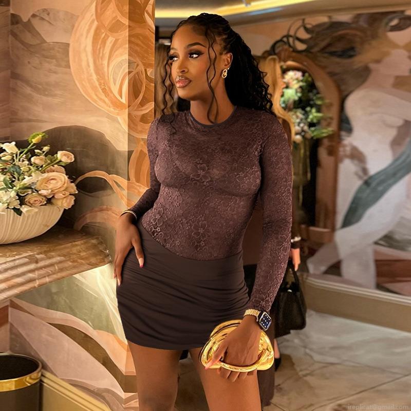 • Sexy Women's Brown Lace Patchwork Bodycon Mini Dress Long Sleeve Round Neck Ruched Slim Fit Romantic Splicing Short Dress For Night Club Party