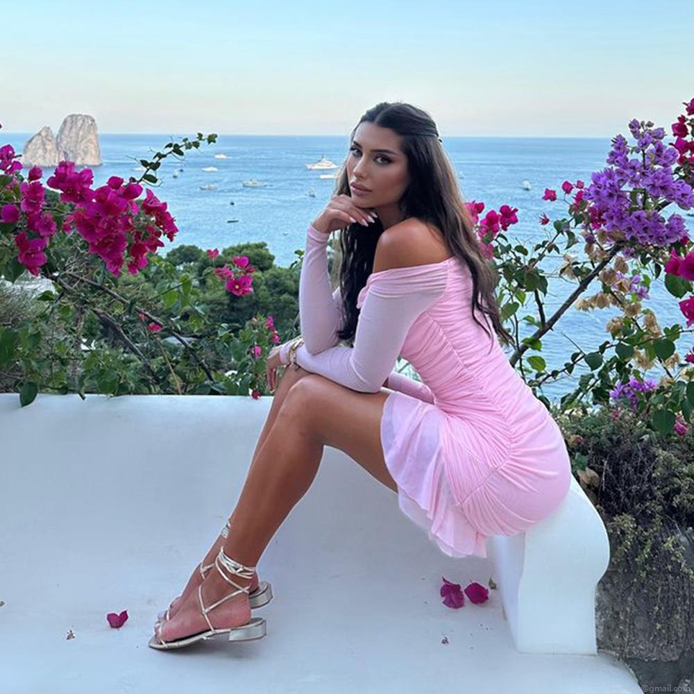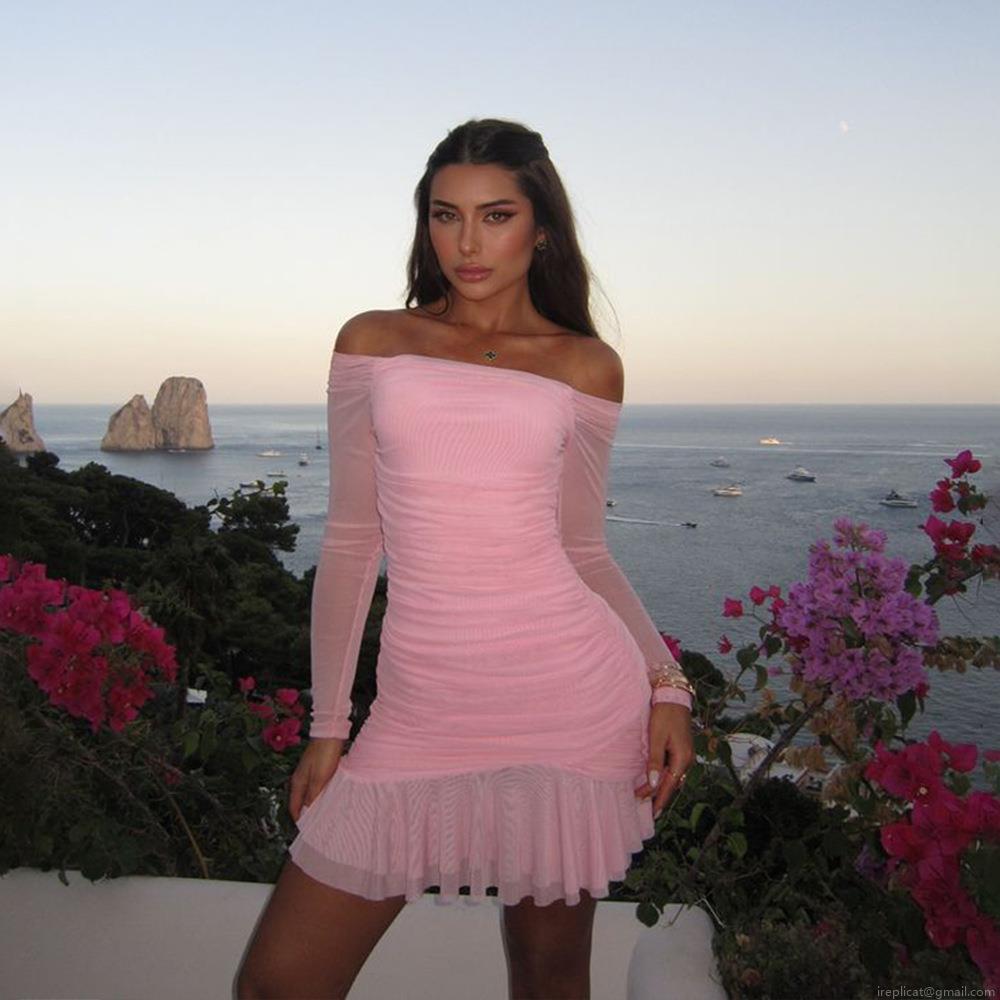 • Sexy Women's Off-Shoulder Ruched Mini Dress Long Sleeve Bodycon Mesh Splicing Ruffle Hem Dress For Party Club Night Out Summer Beach Vacation Fashion