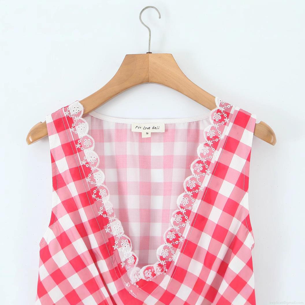 • Summer Vintage Gingham Sleeveless Mini Dress With Lace Trim Deep V-Neck Smocking Slim Fit A-Line Plaid Cotton Blend Dress For Women