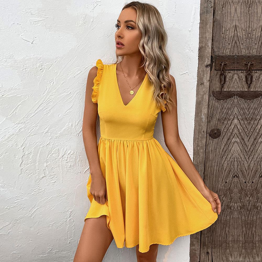• Summer V-Neck Backless Mini Dress With Large Bow Ruffle Strap A-Line Swing Sleeveless Solid Yellow Polyester Spandex Beach Vacation Dress For Women
