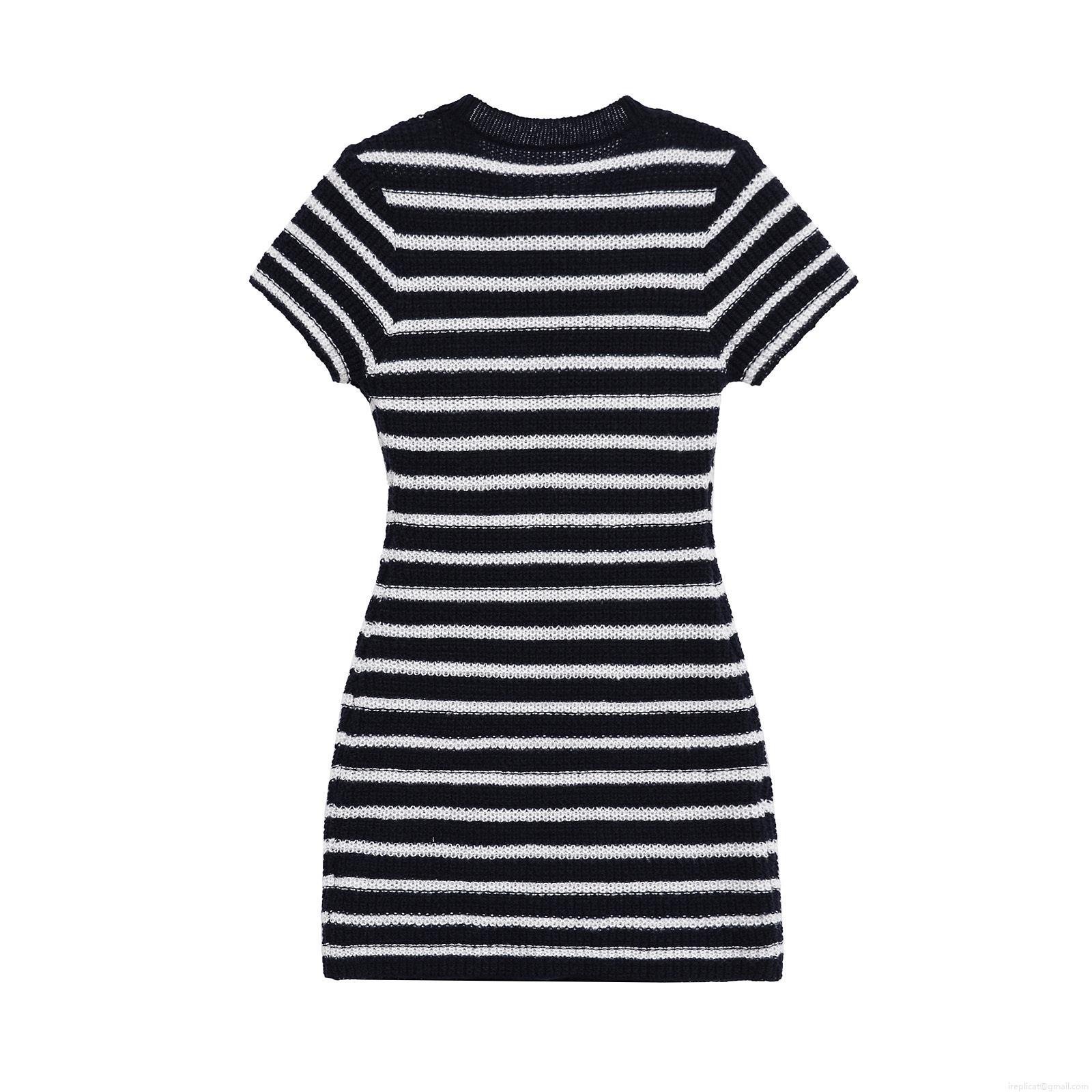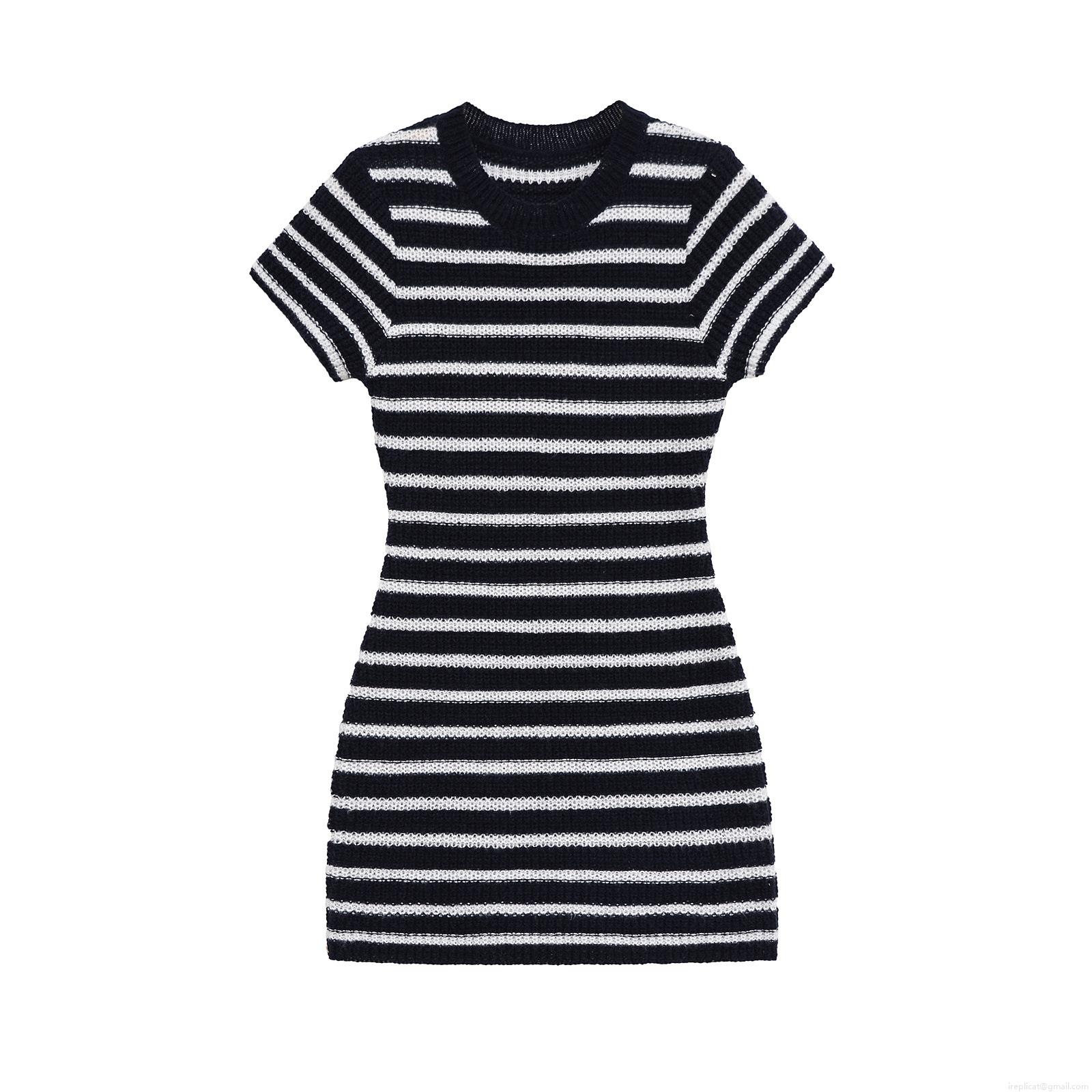 Summer Women Black White Striped Knit Mini Dress Short Sleeve Round Neck Slim Fit Polyester Casual Street Style Bodycon Dress