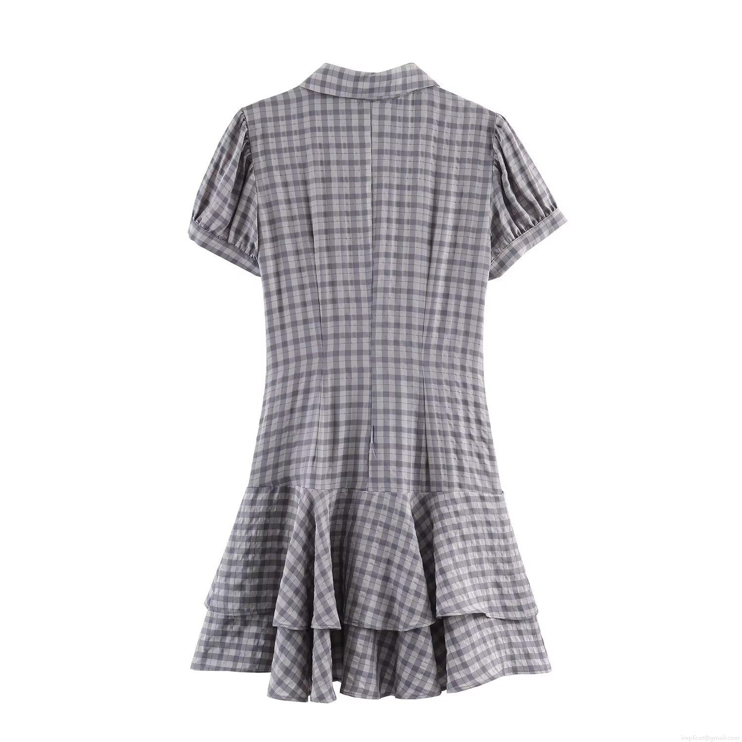 • Summer Women Gingham Layered Mini Dress Shirt Collar Short Sleeve Button Front Puff Sleeve Ruffle Tiered Skirt Polyester Casual Fashion Dress
