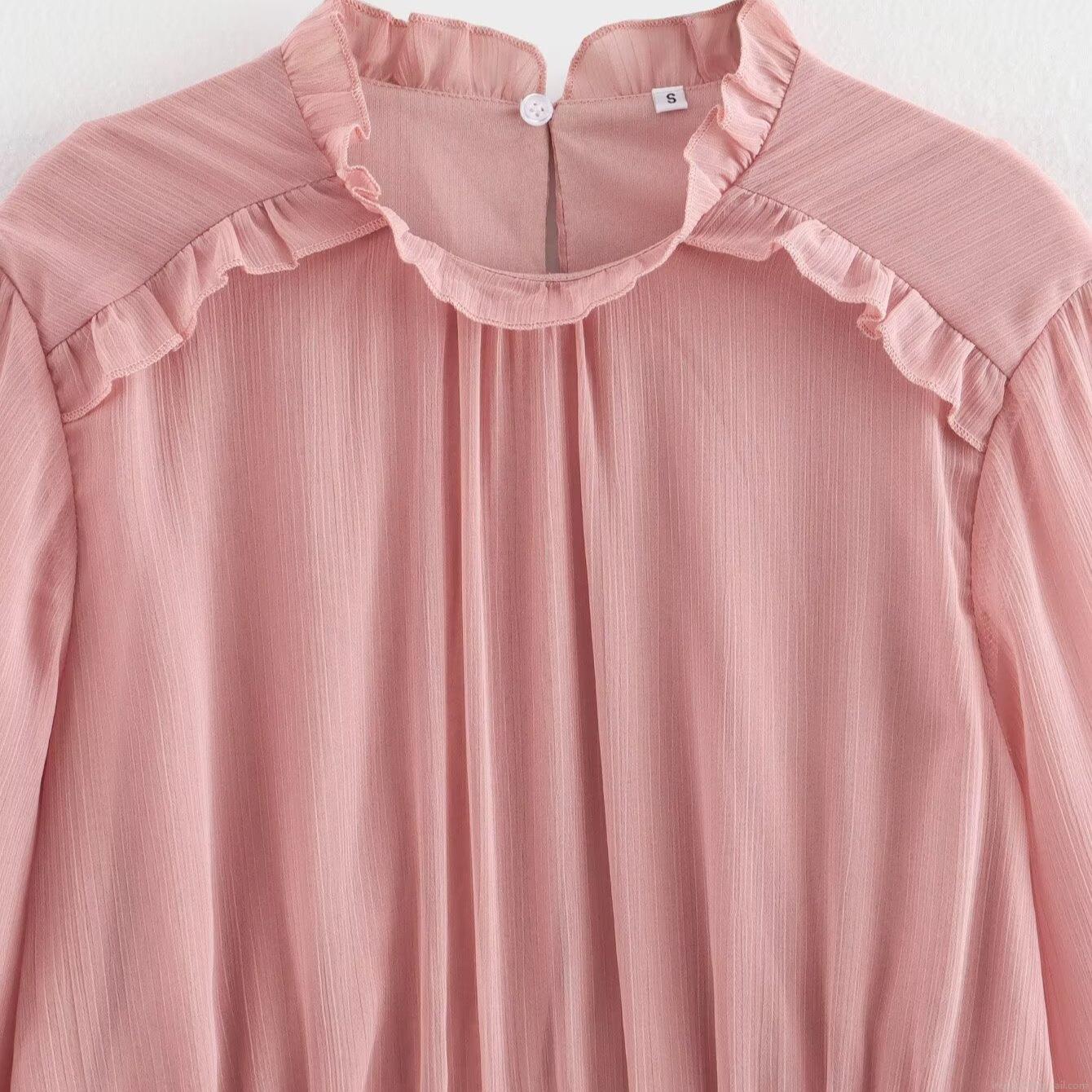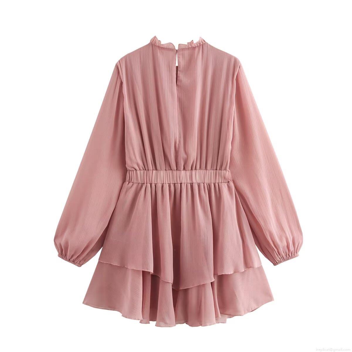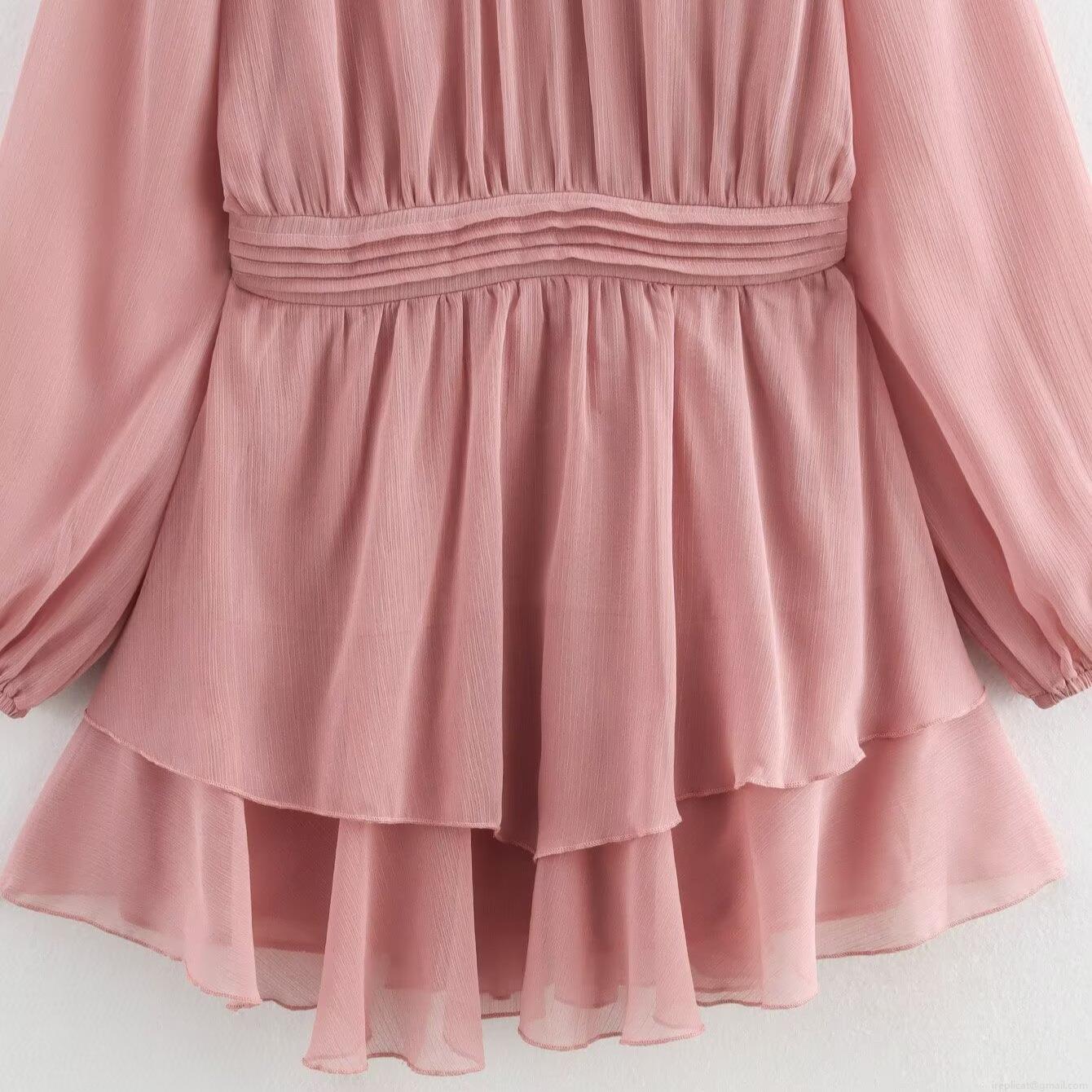 • Sweet Pink Chiffon Dress Ruffle Stand Neck Long Sleeve High Waist Layered A-Line Mini Dress Elegant Flowy Party Wear For Women