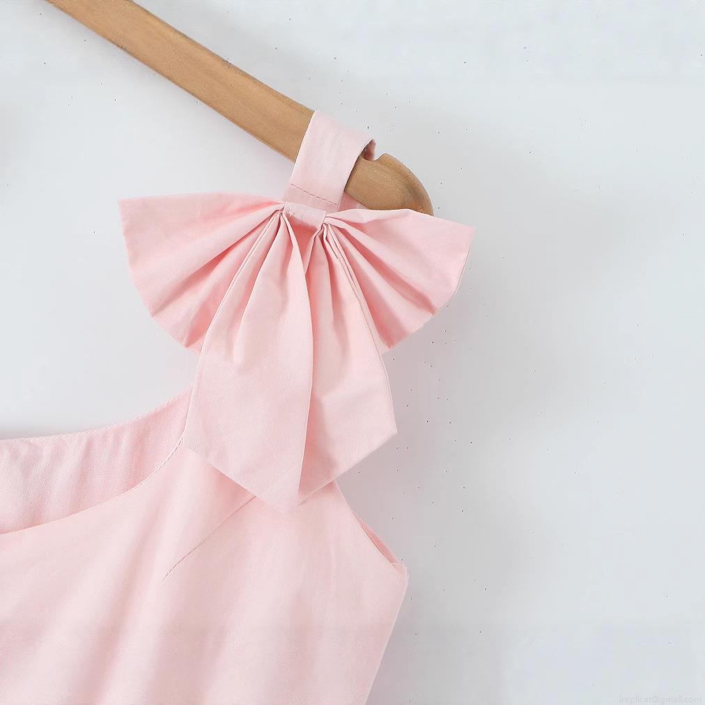 • Sweet Pink Cotton Cami Dress with Bow Shoulder Straps Lace Hem and Decorative Buttons Women's Summer A-line Mini Dress for Party and Dating