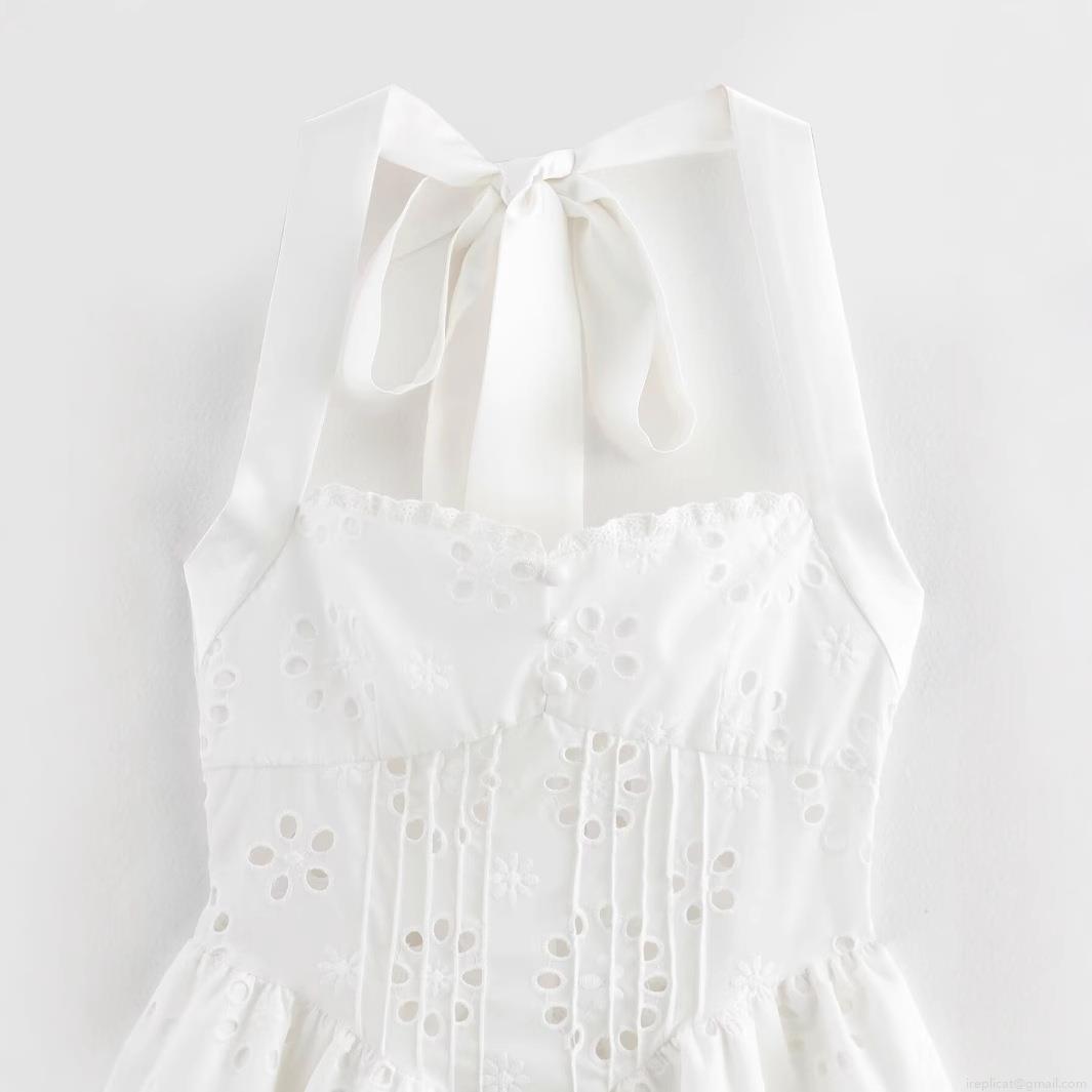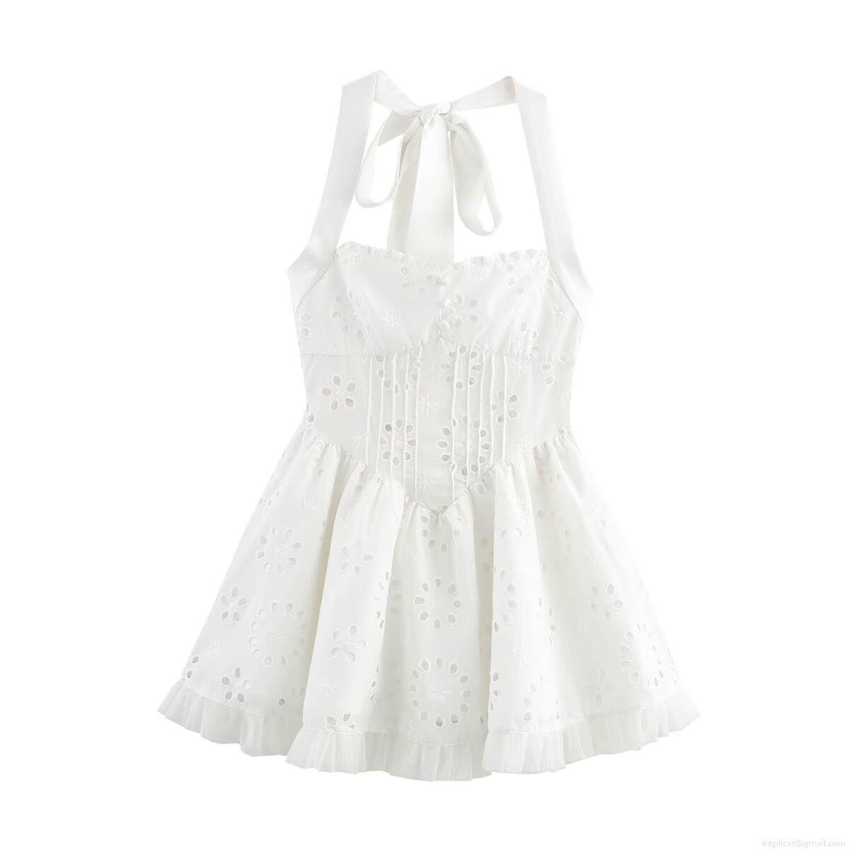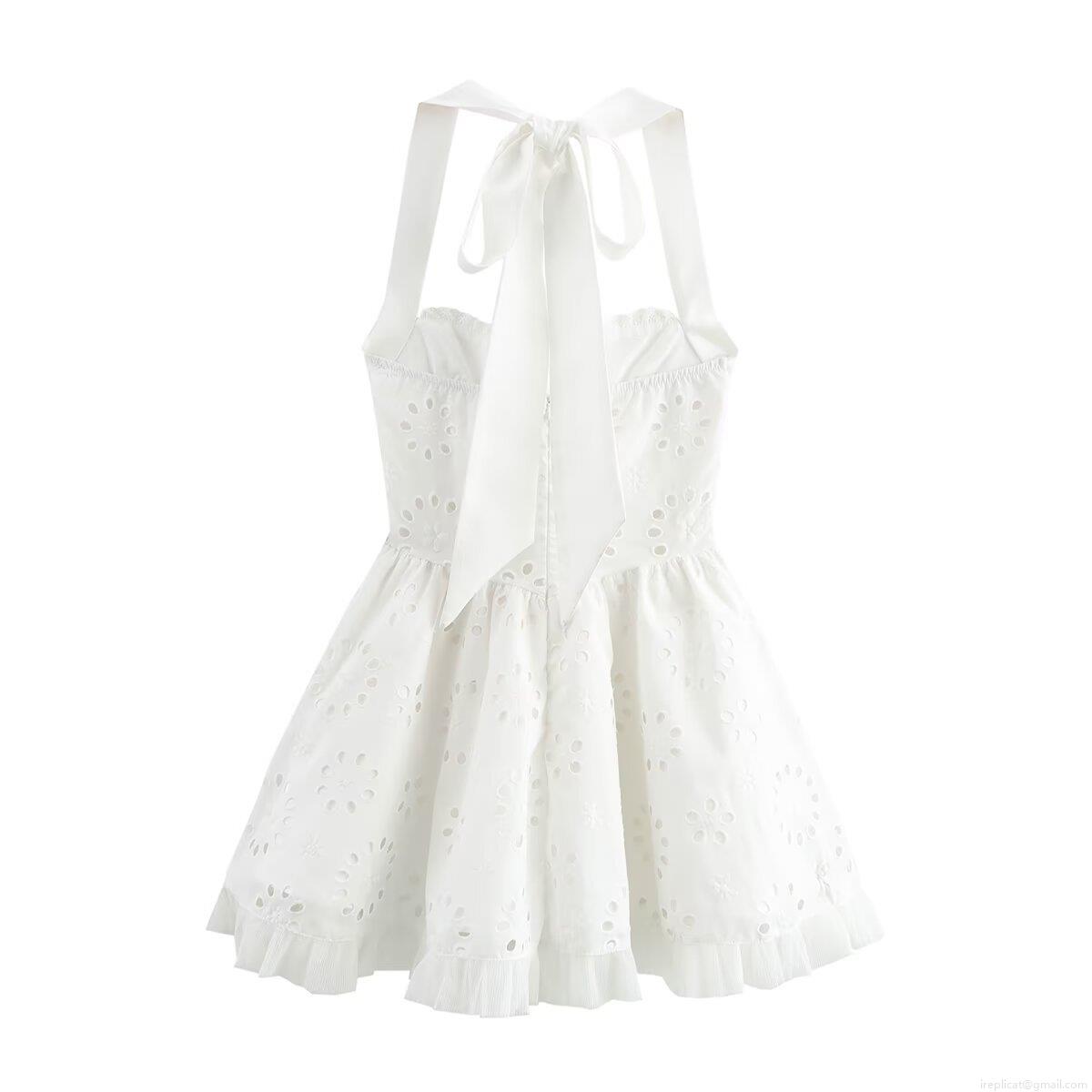 White Halter Neck Polyester Eyelet Embroidery Mini Dress Elegant Hollow Out Sleeveless A-Line Ruffle Hem Bow Tie Back Short Summer Beach Dress
