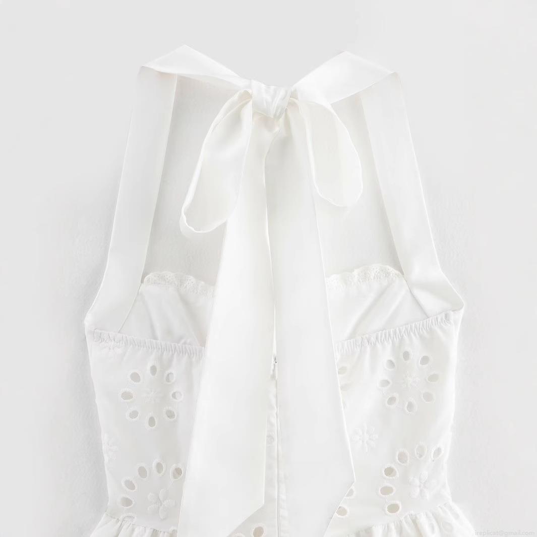 • White Halter Neck Polyester Eyelet Embroidery Mini Dress Elegant Hollow Out Sleeveless A-Line Ruffle Hem Bow Tie Back Short Summer Beach Dress