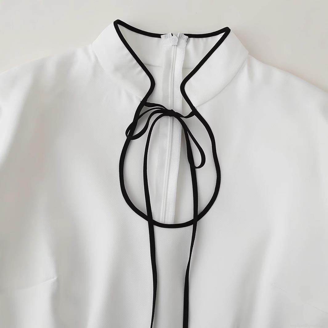 • White Mini Dress 100% Polyester Stand Collar Bow Tie Cutout Long Puff Sleeve Contrast Black Piping High Waist Slimming Elegant Party Dress