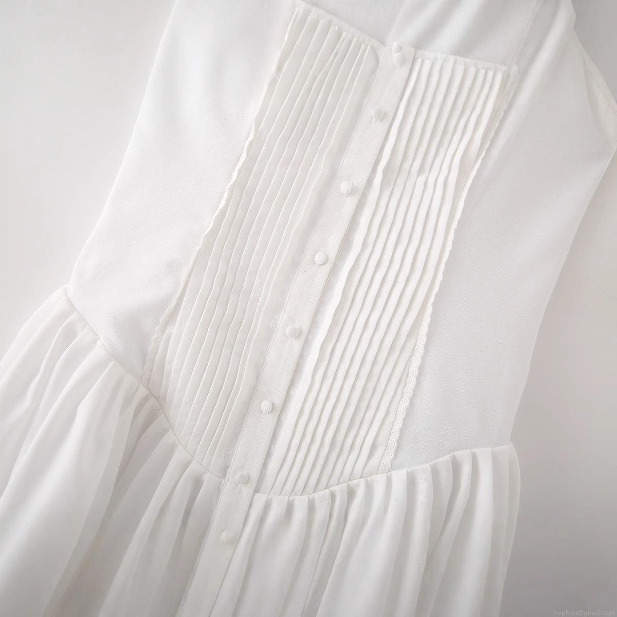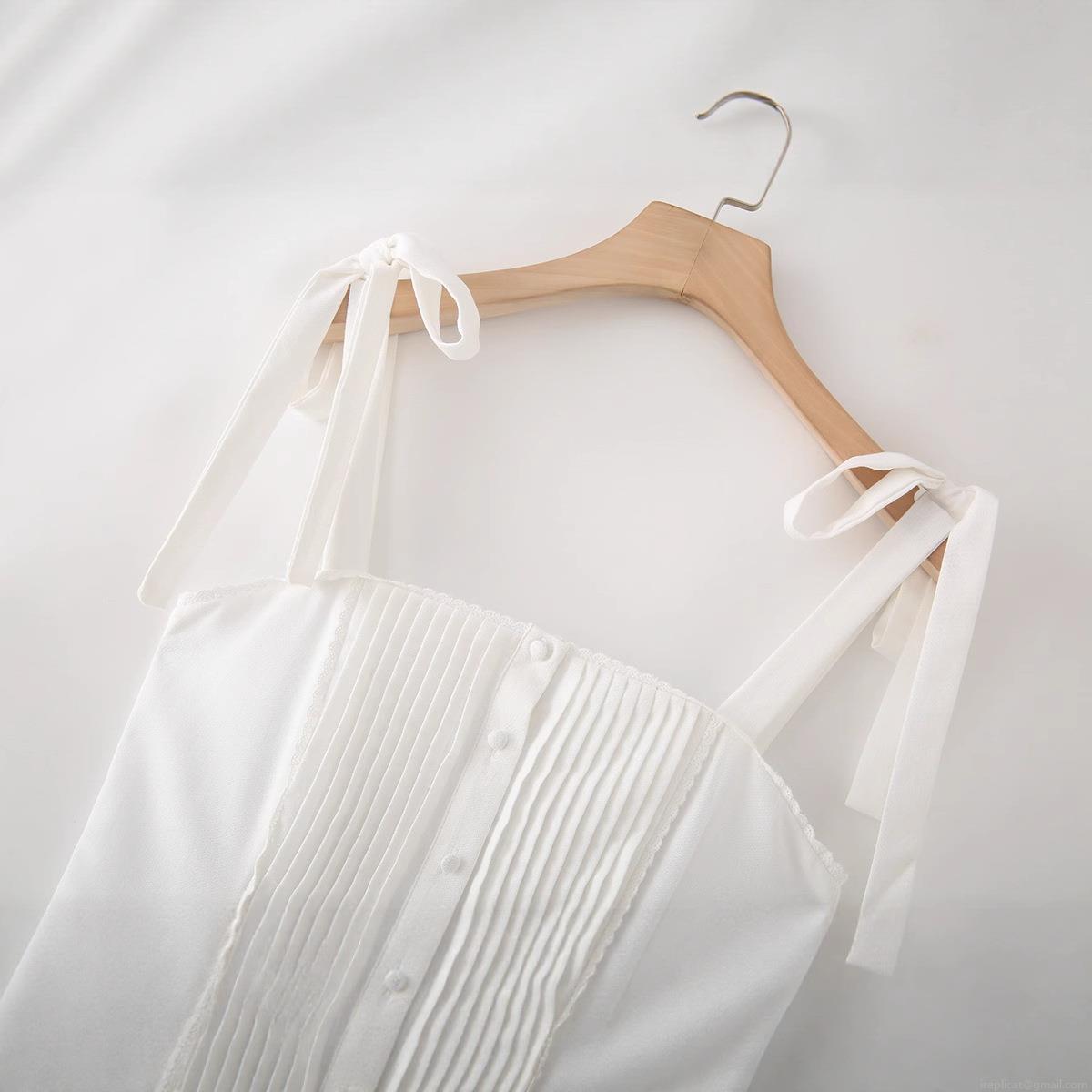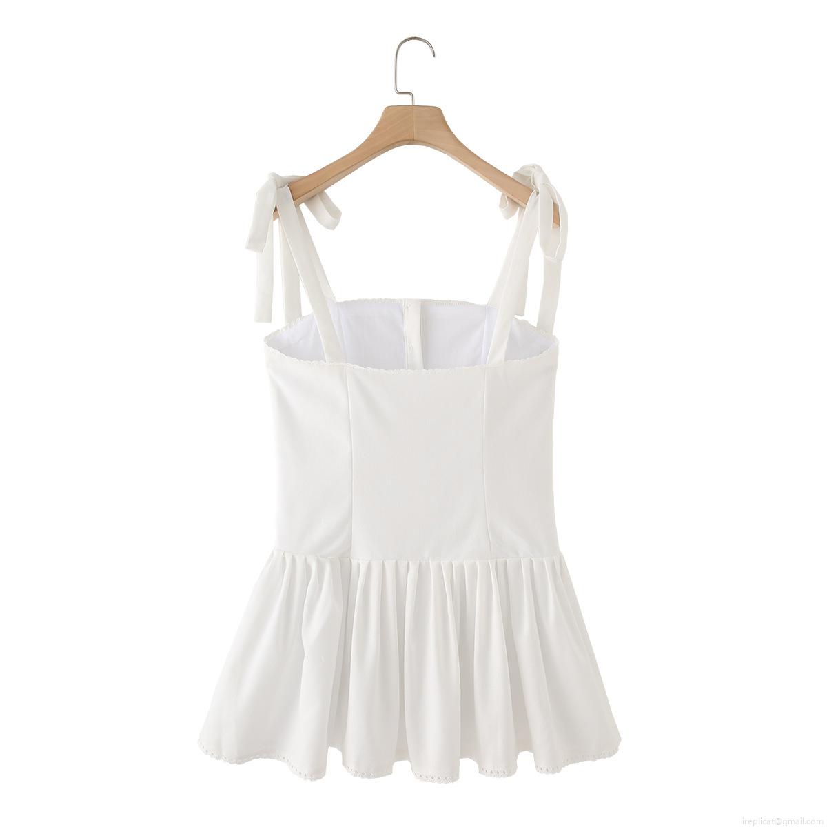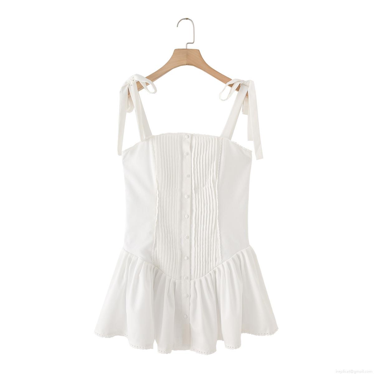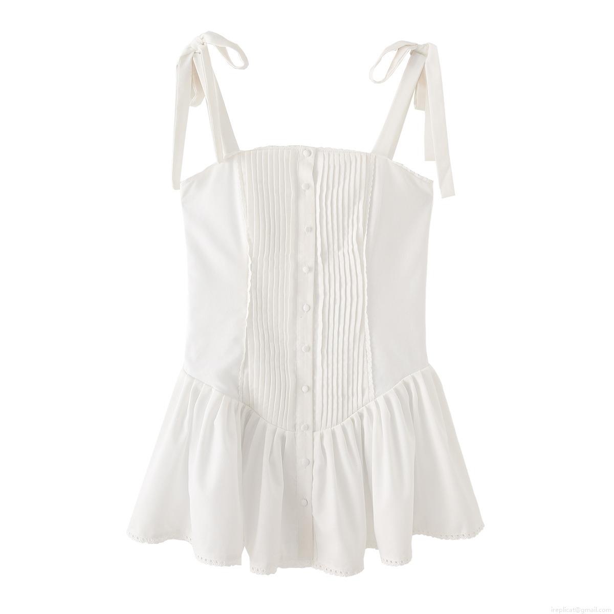• Women 100% Cotton Mini Sling Dress With Bow Tie Straps White Pleated Ruffle Lace Trim Single Breasted Summer Beach Vacation Dress