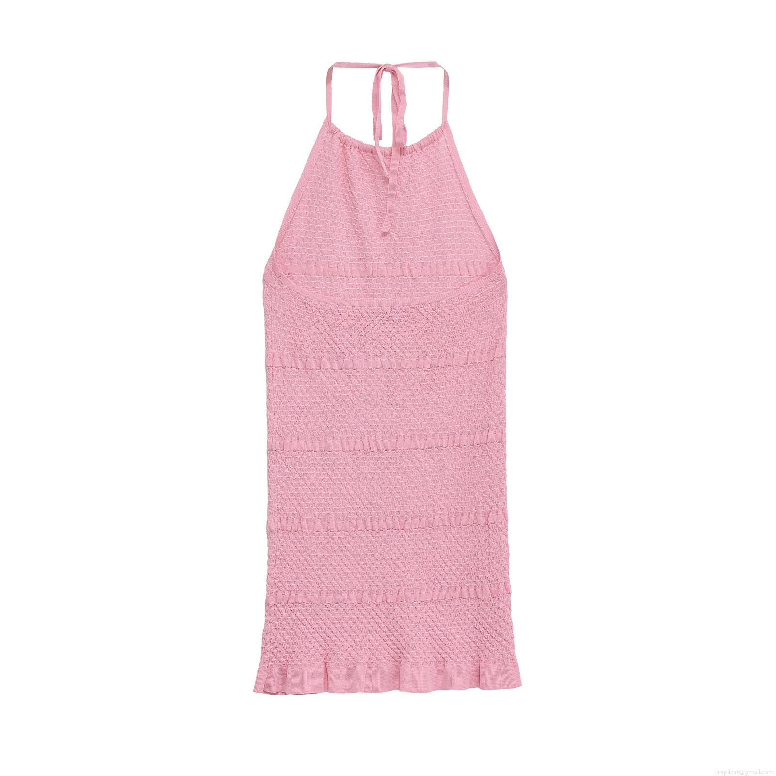 • Women Backless Halter Neck Knitted Mini Dress Sexy Solid Peach Pink Waffle Texture Bodycon Ruffle Hem Sleeveless Vacation Party Summer Streetwear Outfits