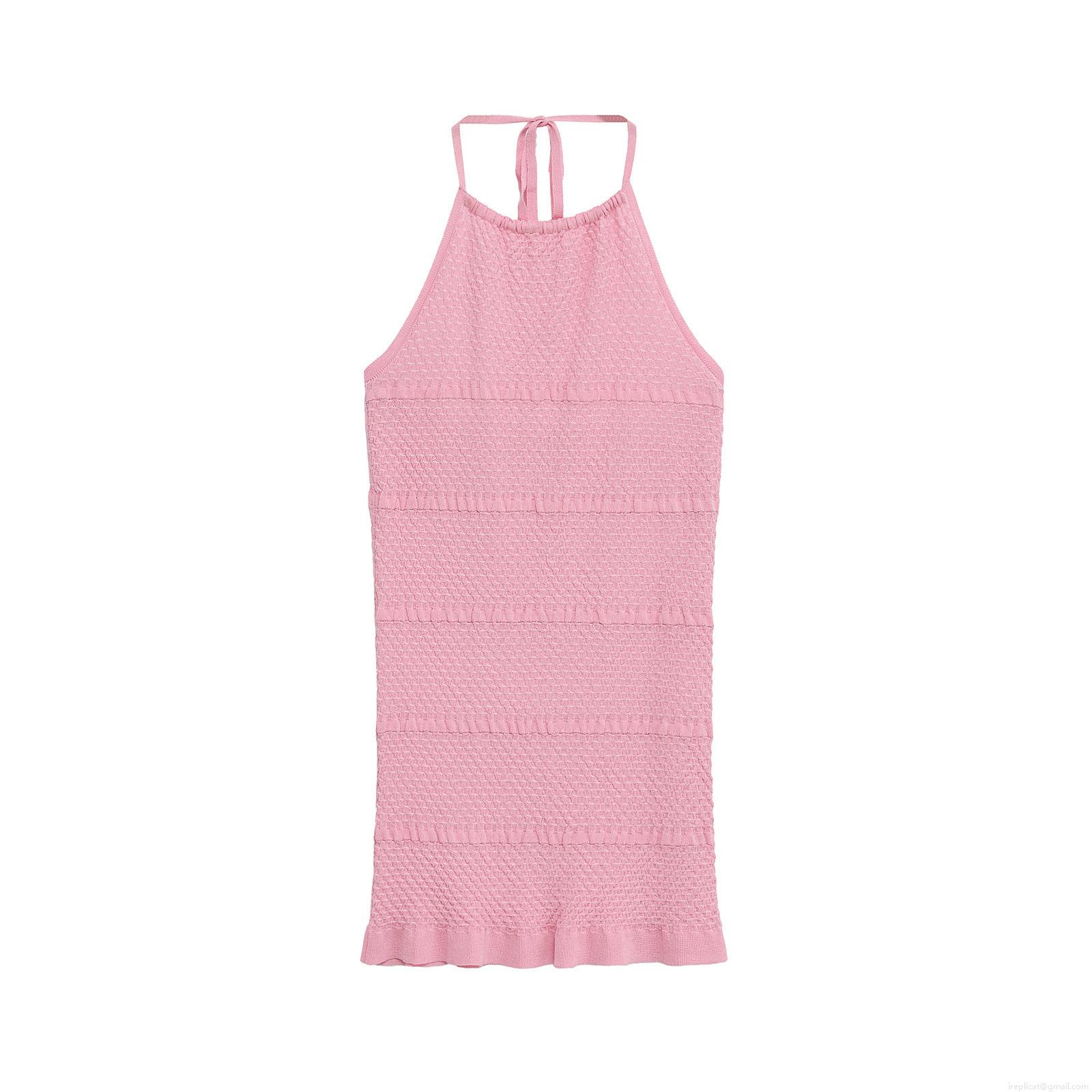 Women Backless Halter Neck Knitted Mini Dress Sexy Solid Peach Pink Waffle Texture Bodycon Ruffle Hem Sleeveless Vacation Party Summer Streetwear Outfits