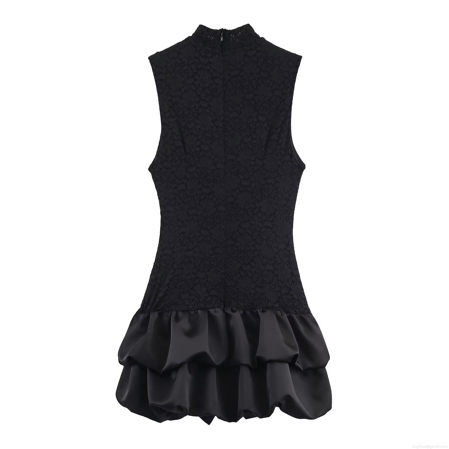 Women Black Sleeveless Patchwork Lace Mini Dress Satin Ruffle Hem Slim Fit Sexy High Neck Party Dress Elegant Bodycon Short Evening Gown