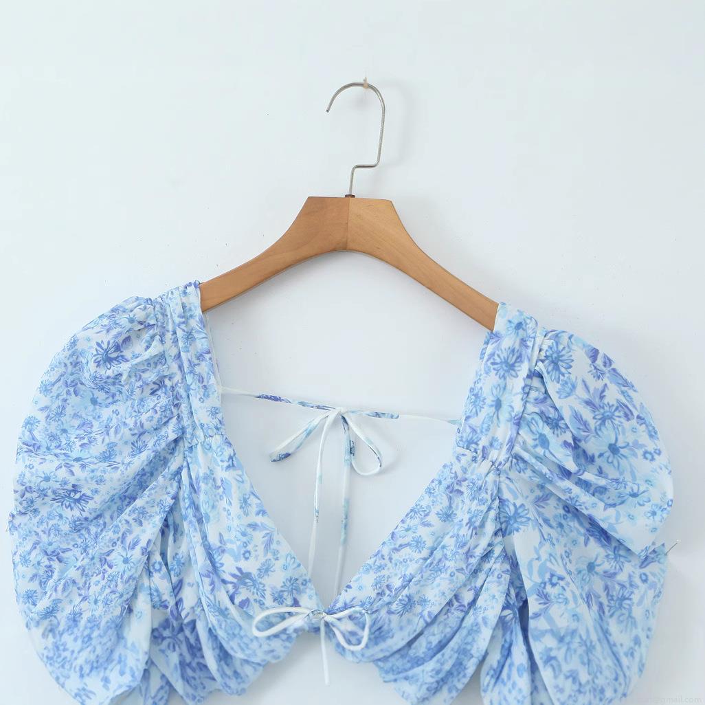 Floral Pattern, V-neck, Lace Patchwork, Puff Sleeves, Blue And White Porcelain Pattern