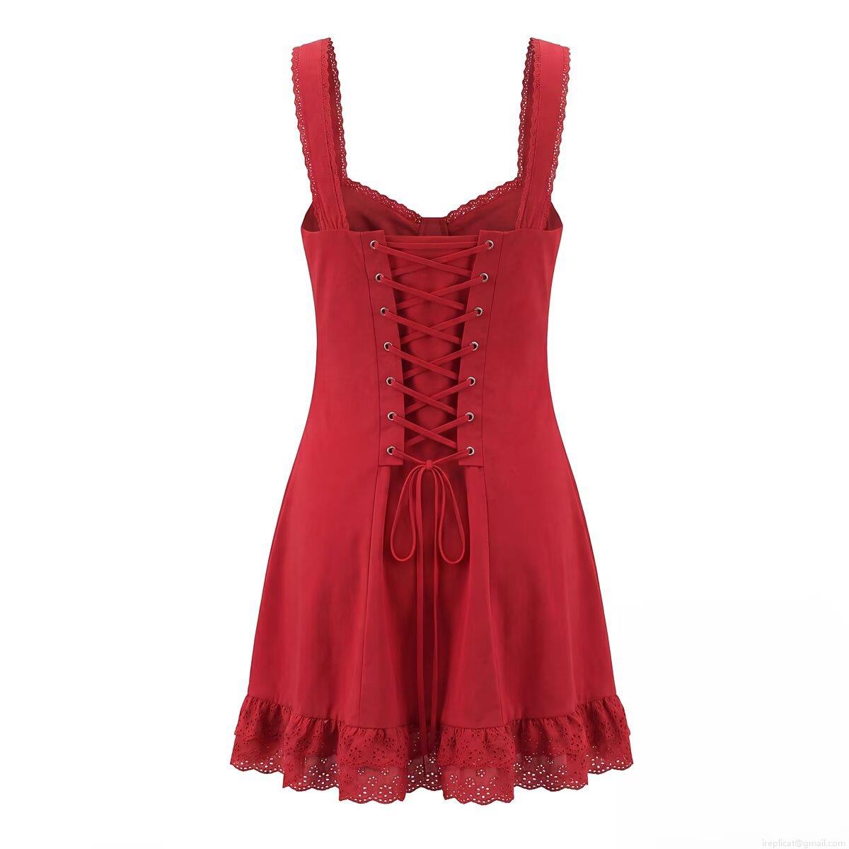 • Women Cotton Hollow Out Embroidery Camisole Dress Back Tie-Up Ruffle Hem Button Down Lace Trim Lolita Sweet Sexy Mini Dress