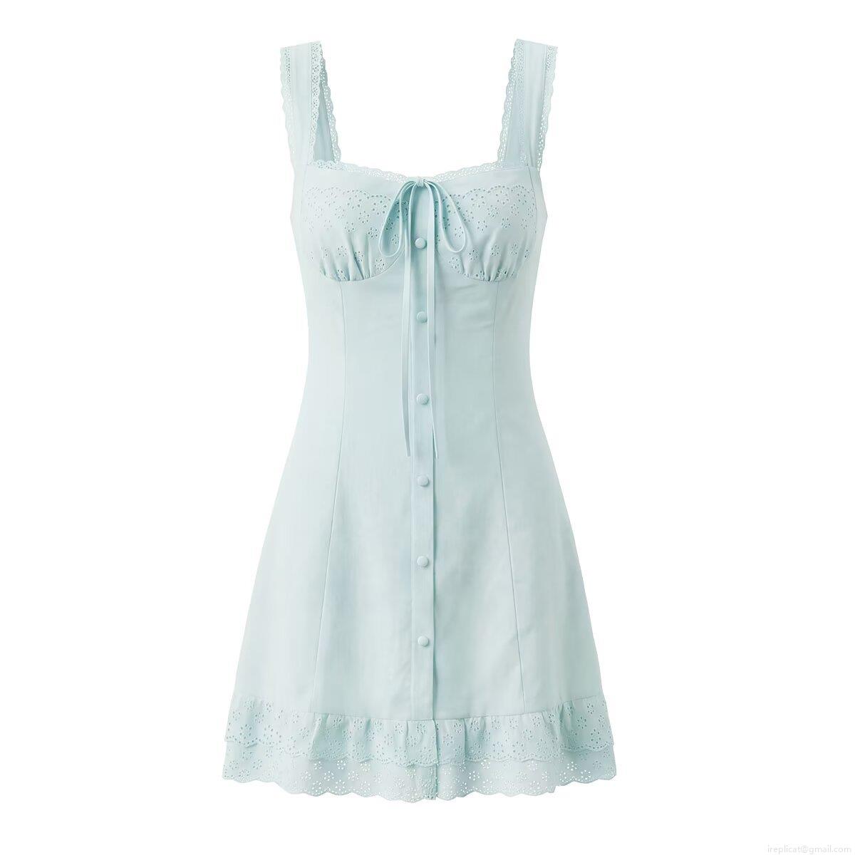 Women Cotton Hollow Out Embroidery Camisole Dress Back Tie-Up Ruffle Hem Button Down Lace Trim Lolita Sweet Sexy Mini Dress