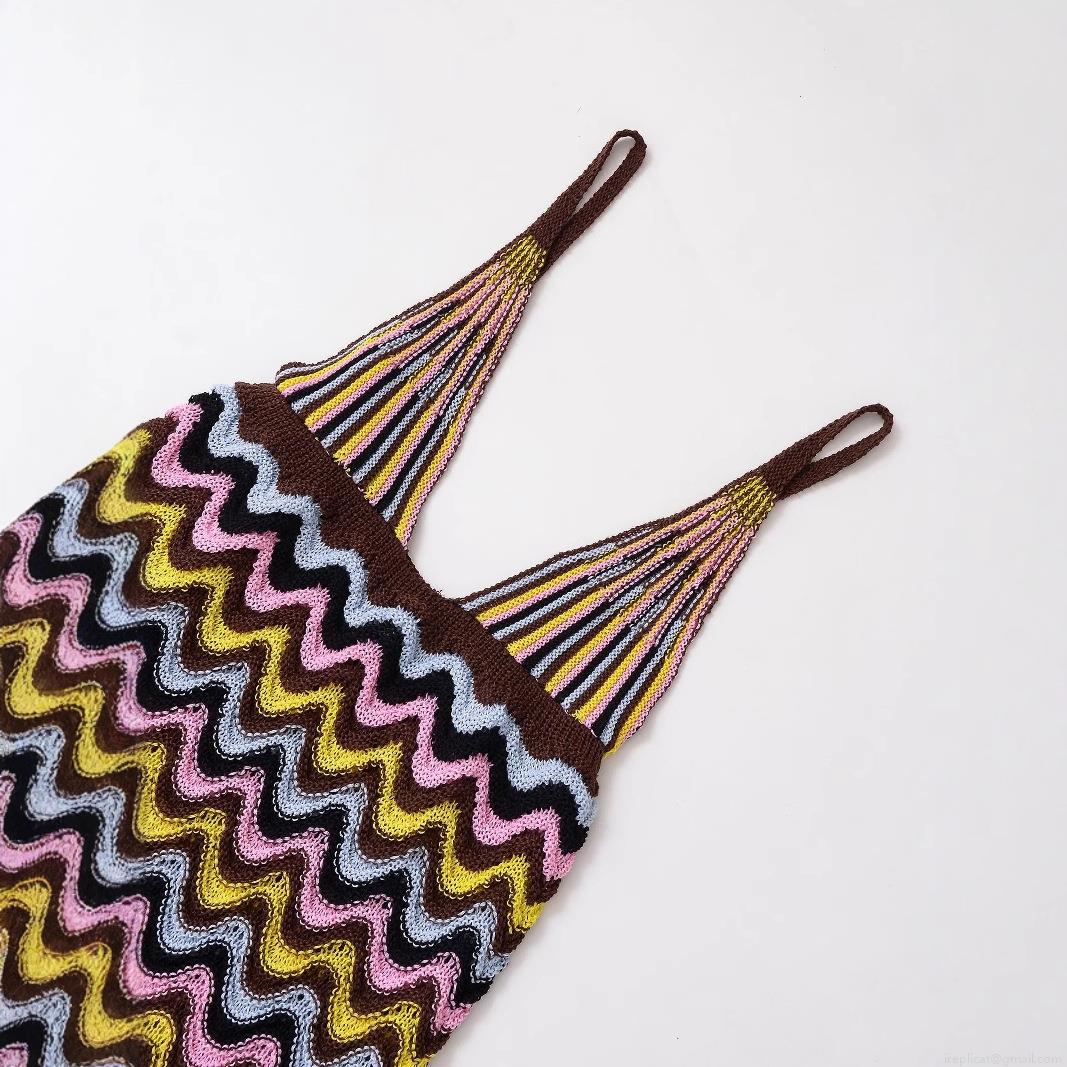 • Women Crochet Knitted Mini Dress Bohemian Zigzag Wave Print Sleeveless V-Neck Spaghetti Strap Bodycon Dress With Tassel Fringe For Summer Beach Vacation Party
