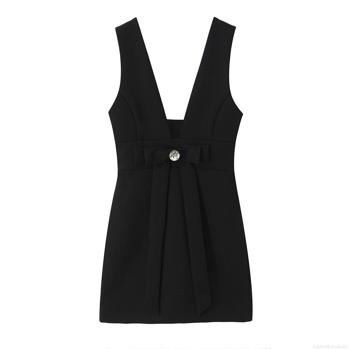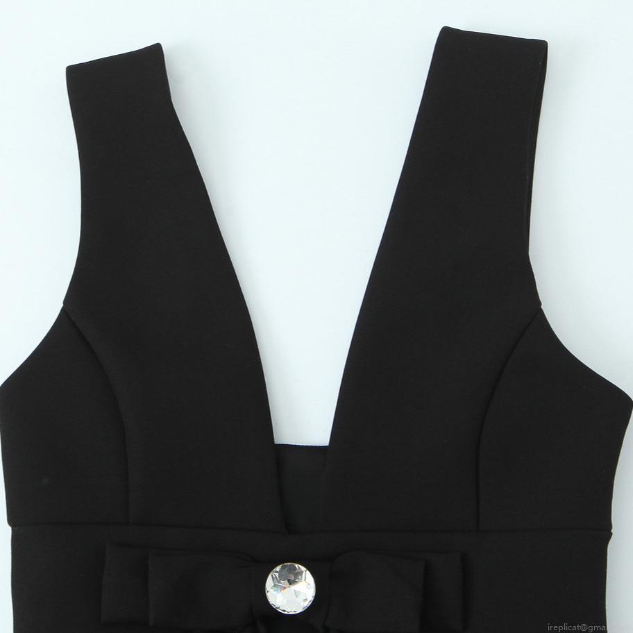 • Women Deep V Neck Sleeveless Mini Dress Elegant Black Slim Fit High Waist Dress With Bow Rhinestone Decoration For Party Club Wear
