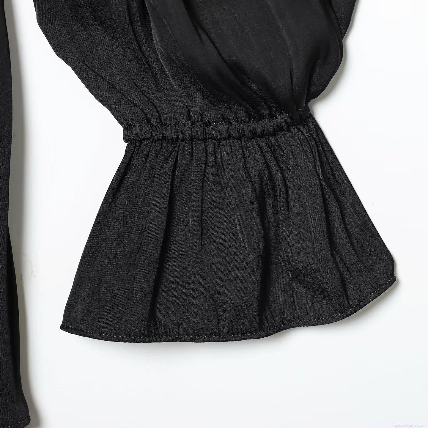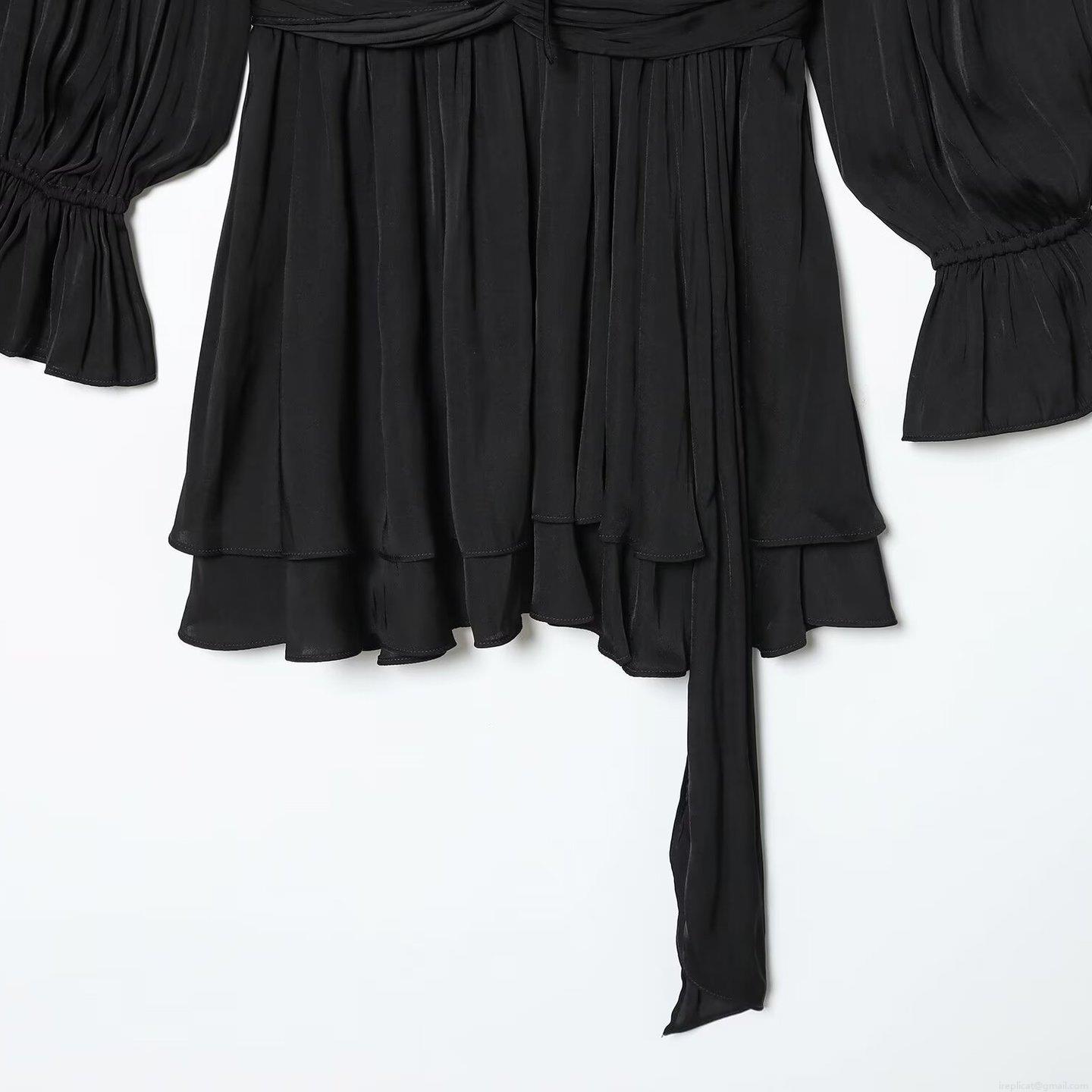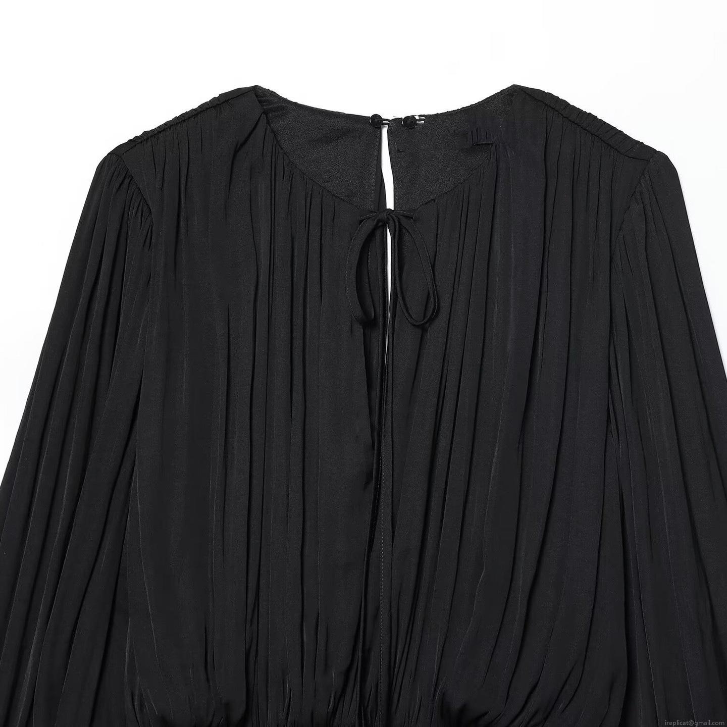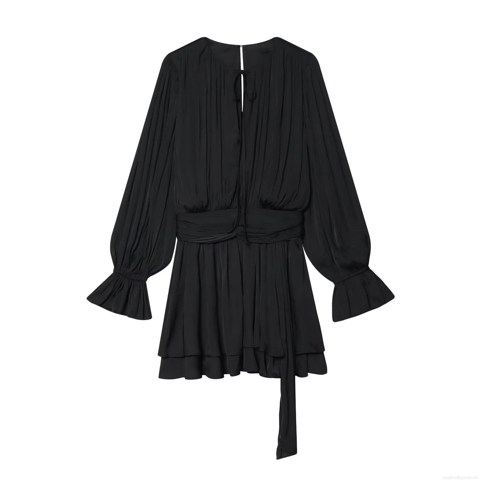 • Women Elegant Black Island Satin Pleated Mini Dress Long Sleeve Tie Neck Ruffle Cuff A-Line Cocktail Party Dress For Women Chic Winter Fashion Clothing