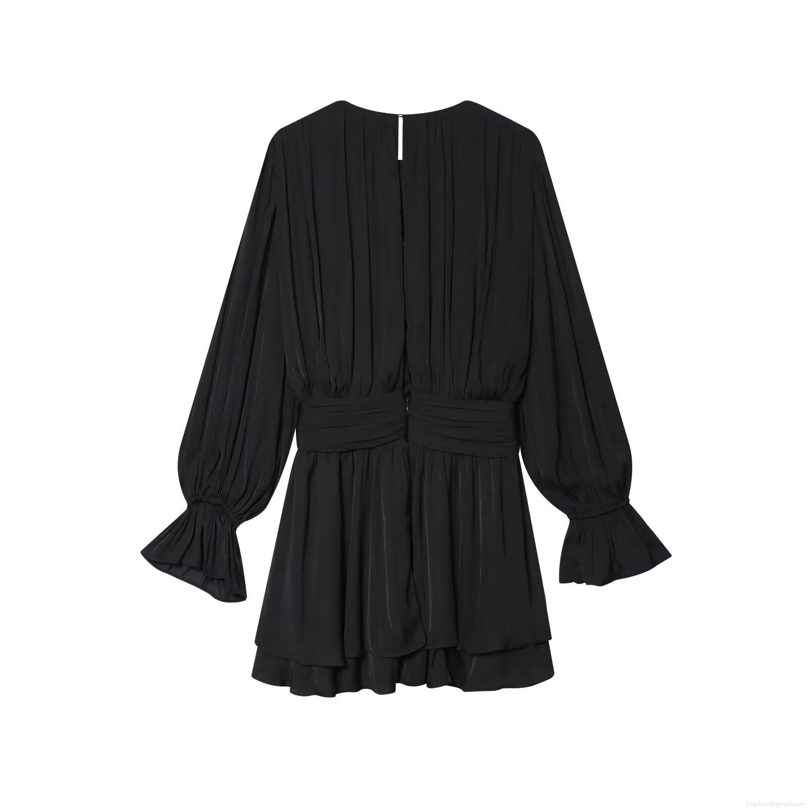 Women Elegant Black Island Satin Pleated Mini Dress Long Sleeve Tie Neck Ruffle Cuff A-Line Cocktail Party Dress For Women Chic Winter Fashion Clothing