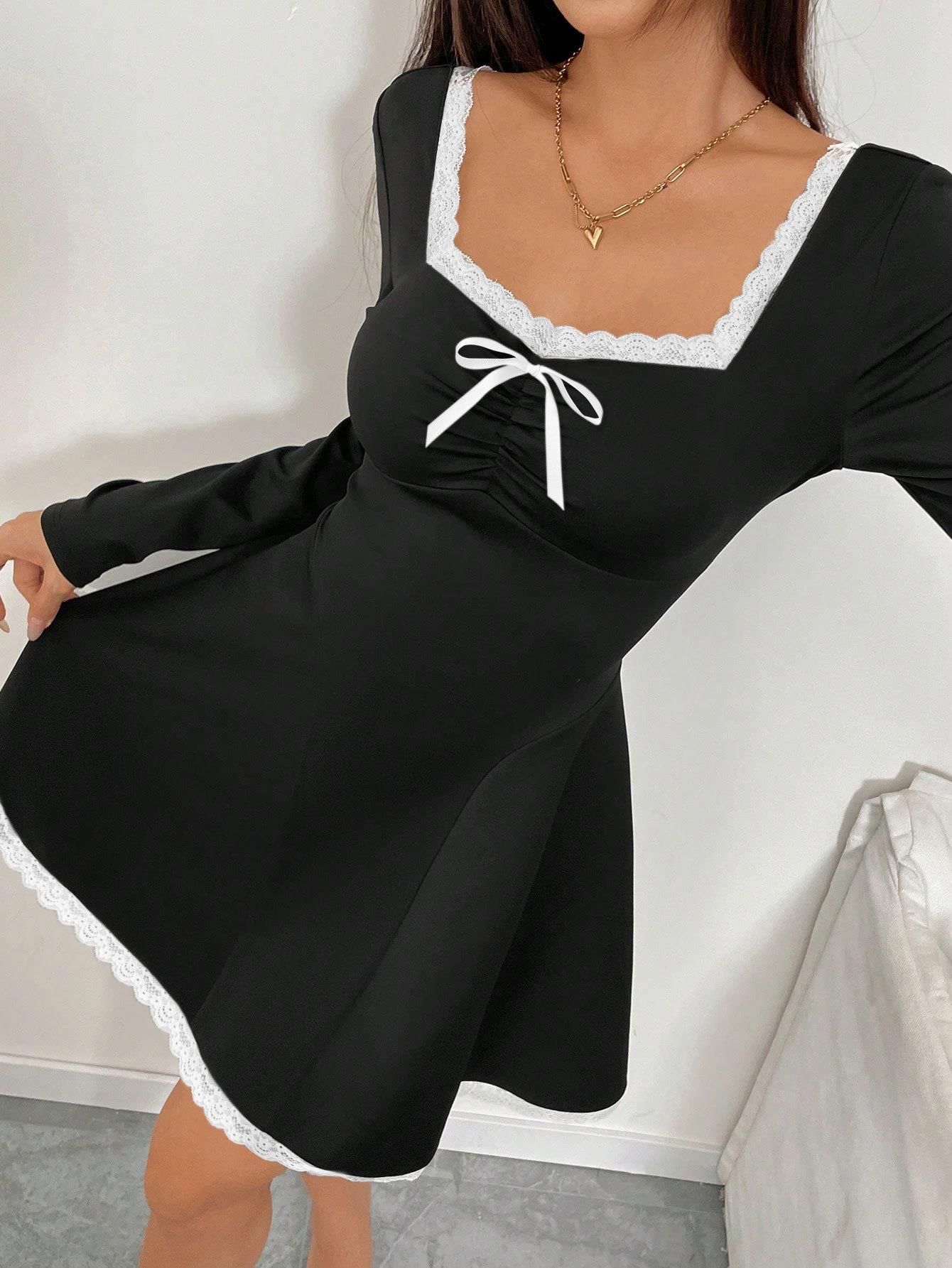 • Women Elegant Black Knitting Long Sleeve Mini Dress White Lace Trim Contrast Bow Square Neck Slim Fit A-Line Short Dress For Fall Winter Date Night