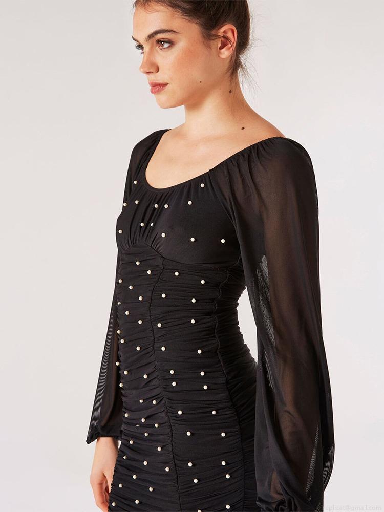 Women Elegant Black Ruched Mini Dress Mesh Long Sleeve Pearl Beaded Backless Slim Fit Polyester Mesh Dress For Party Sexy Evening Clubwear