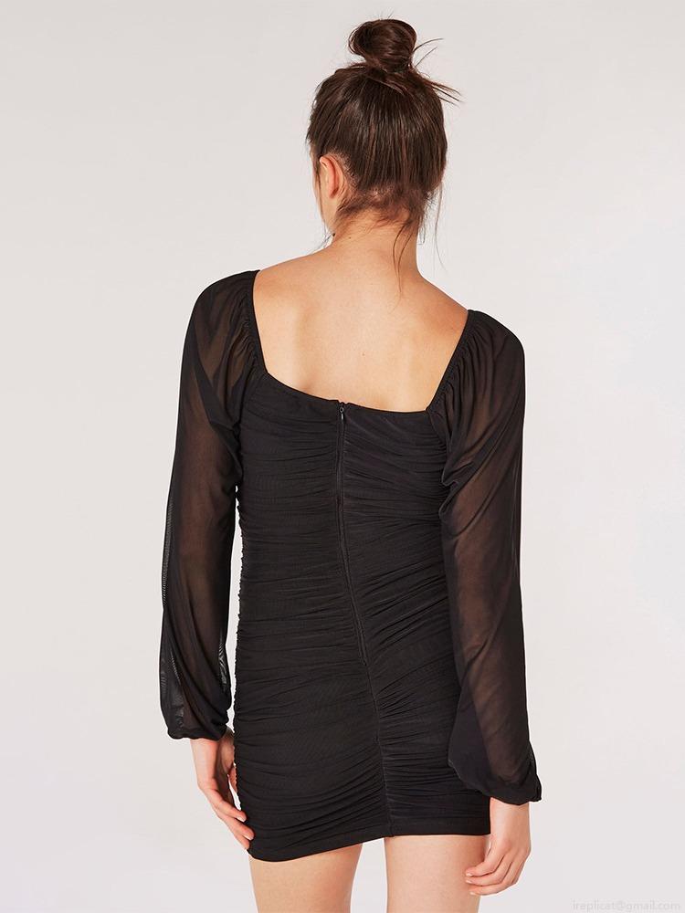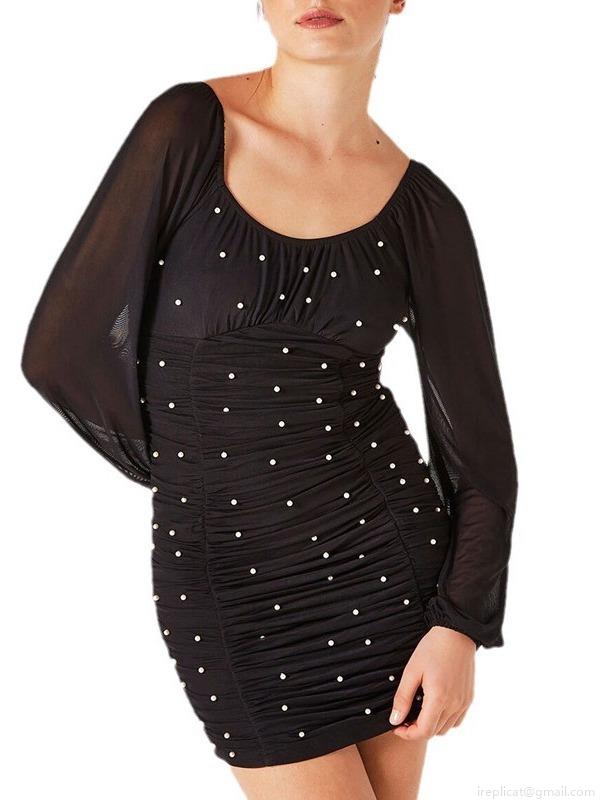 • Women Elegant Black Ruched Mini Dress Mesh Long Sleeve Pearl Beaded Backless Slim Fit Polyester Mesh Dress For Party Sexy Evening Clubwear