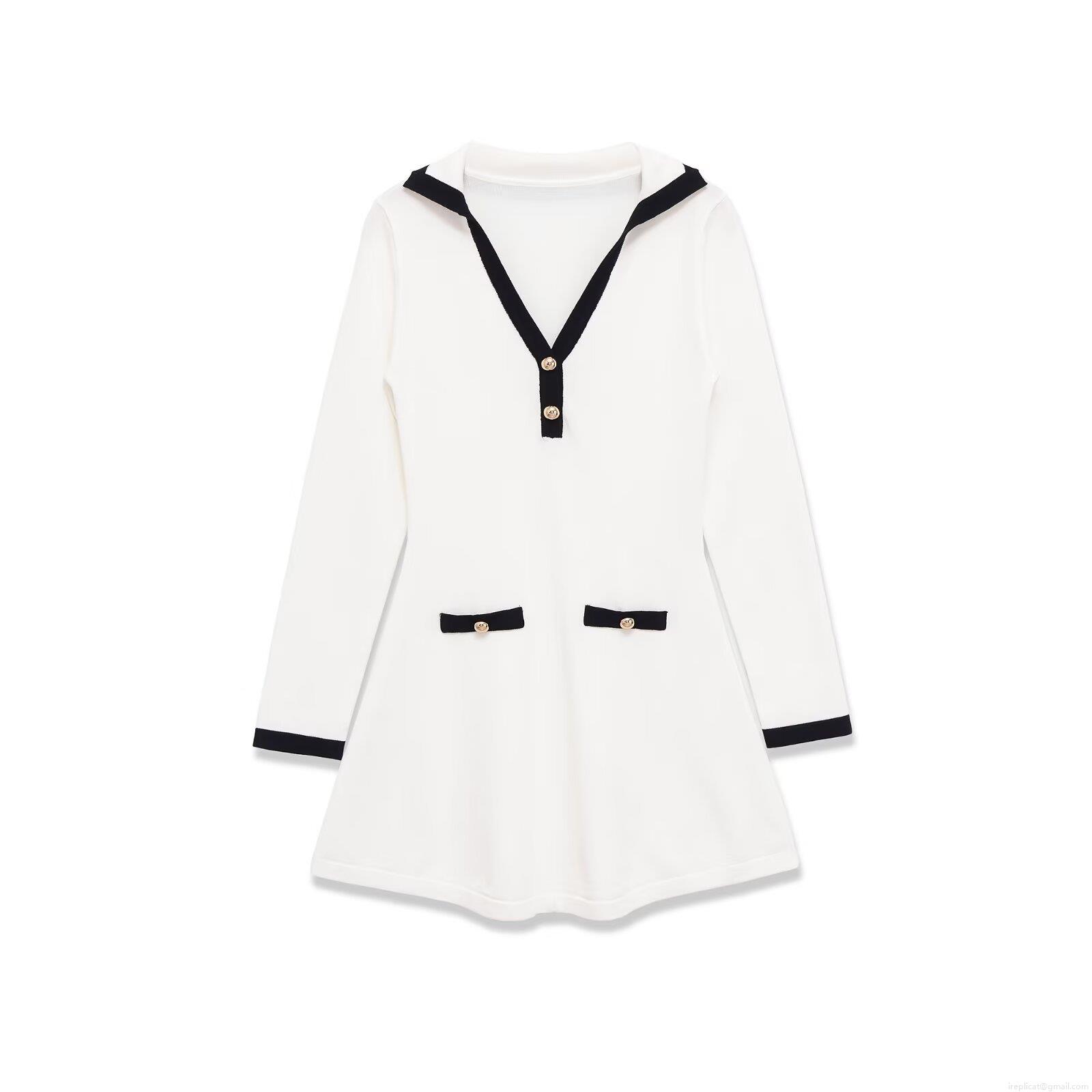• Women Elegant Deep V-Neck Contrast Trim Mini Dress Long Sleeve Slim Fit Gold Button Decoration Preppy Style Short Dresses For Office Party Lady
