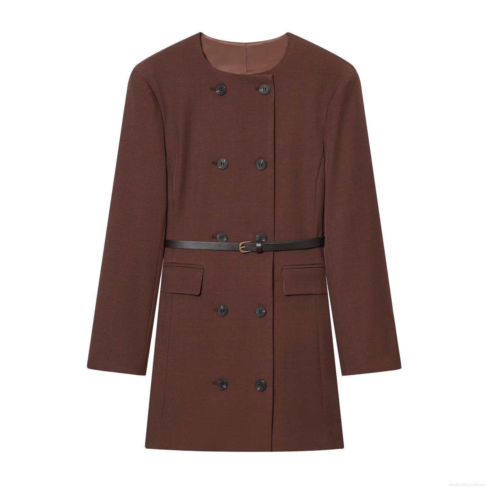 Women Elegant Double Breasted Blazer Dress Round Neck Long Sleeve Mini Dress With Black Leather Belt Slim Fit Office Lady Coffee Brown Short Dress