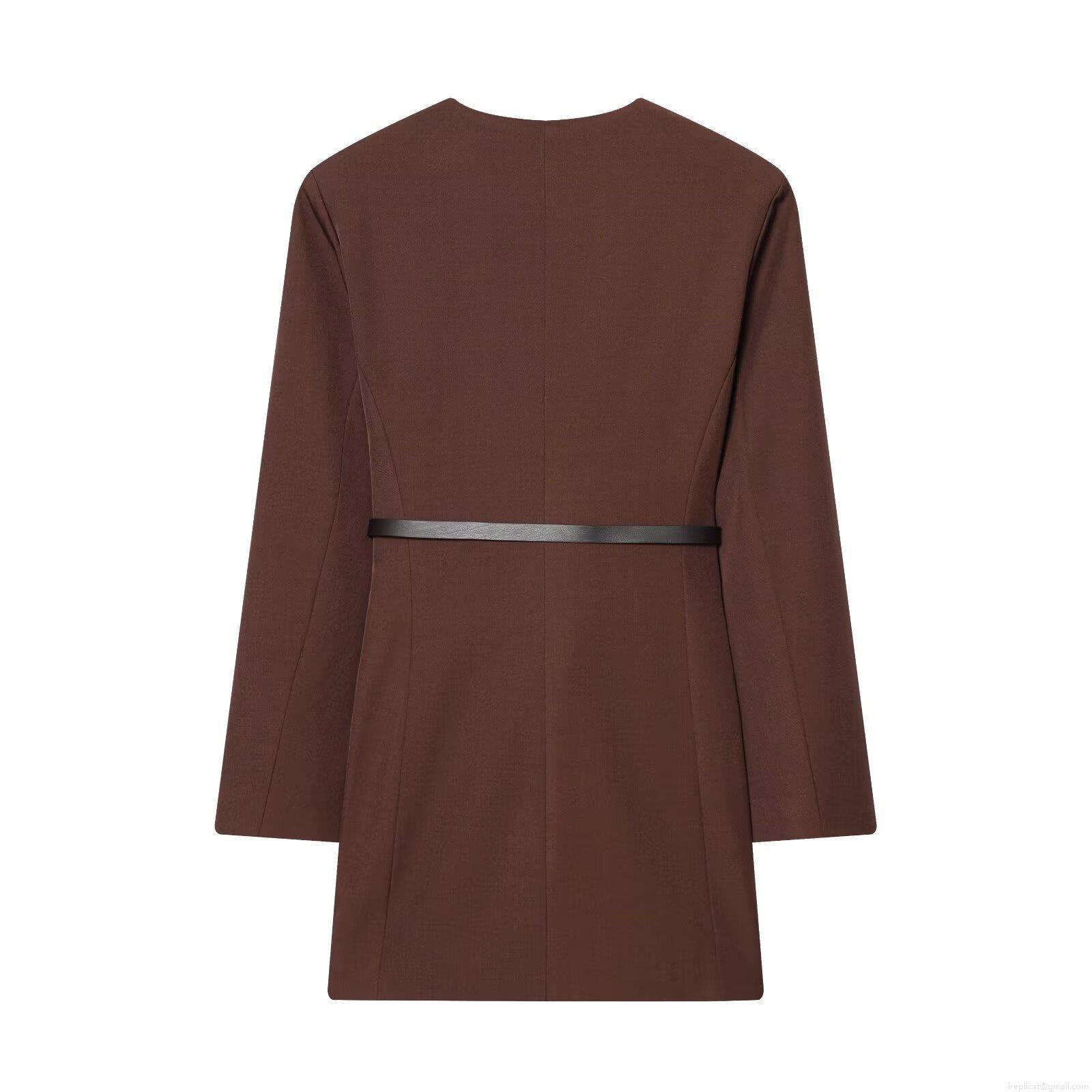 • Women Elegant Double Breasted Blazer Dress Round Neck Long Sleeve Mini Dress With Black Leather Belt Slim Fit Office Lady Coffee Brown Short Dress