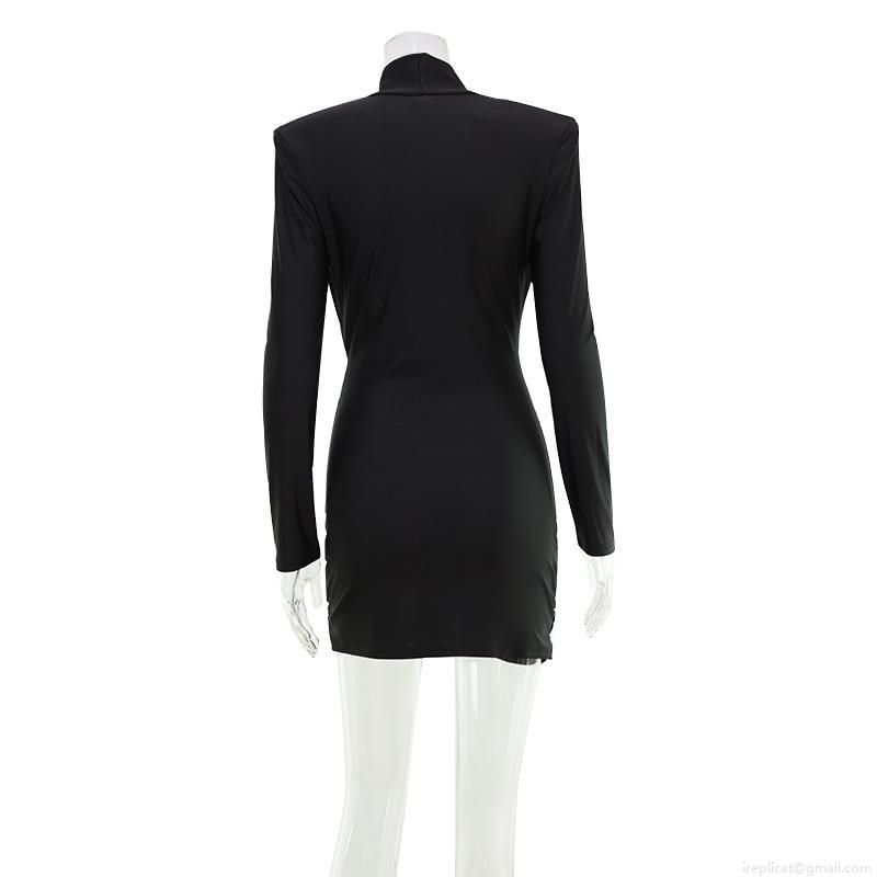 • Women Elegant High Neck Long Sleeve Mini Dress Polyester Spandex Ruched Bodycon Shoulder Pads Slim Fit Irregular Hem Office Party Short Dress