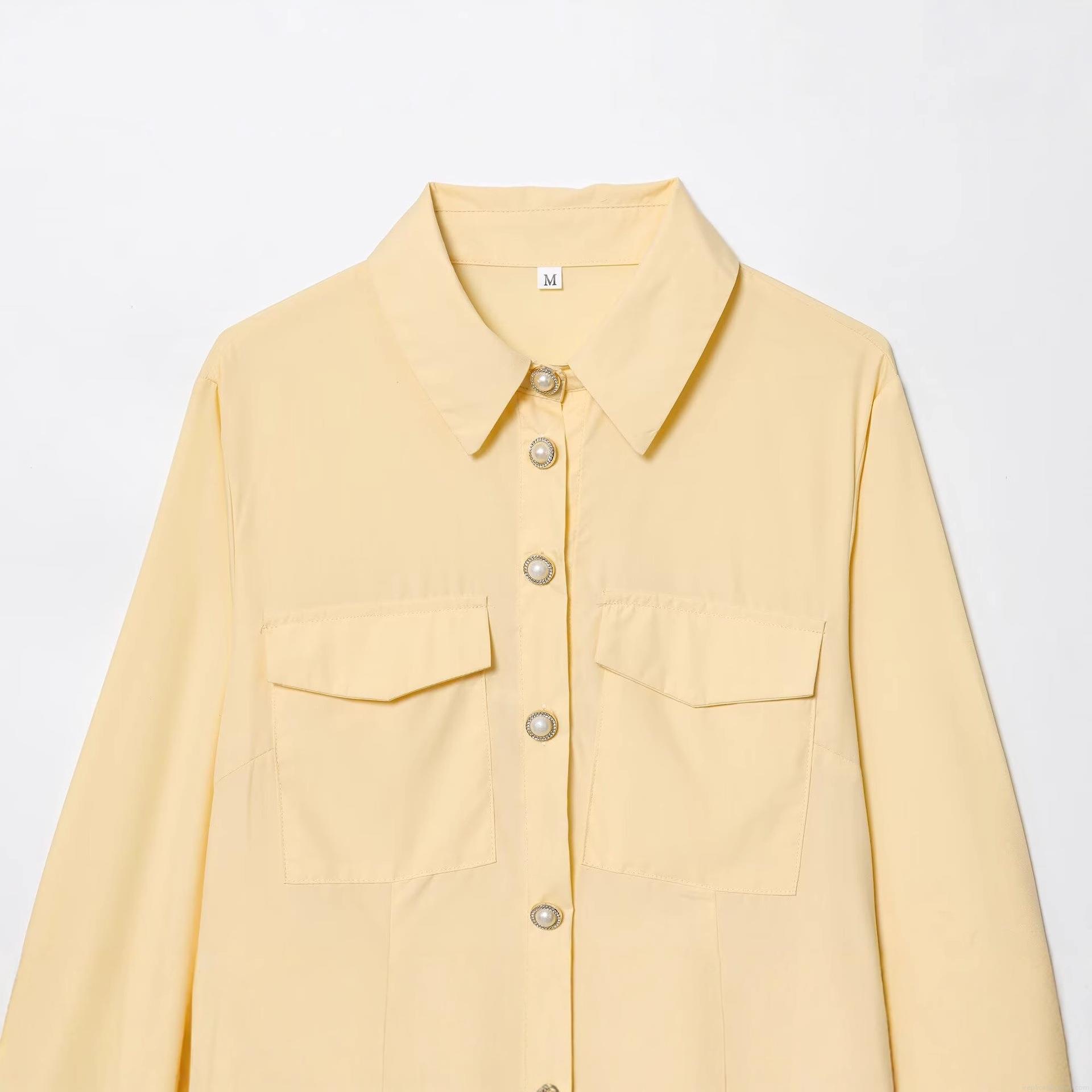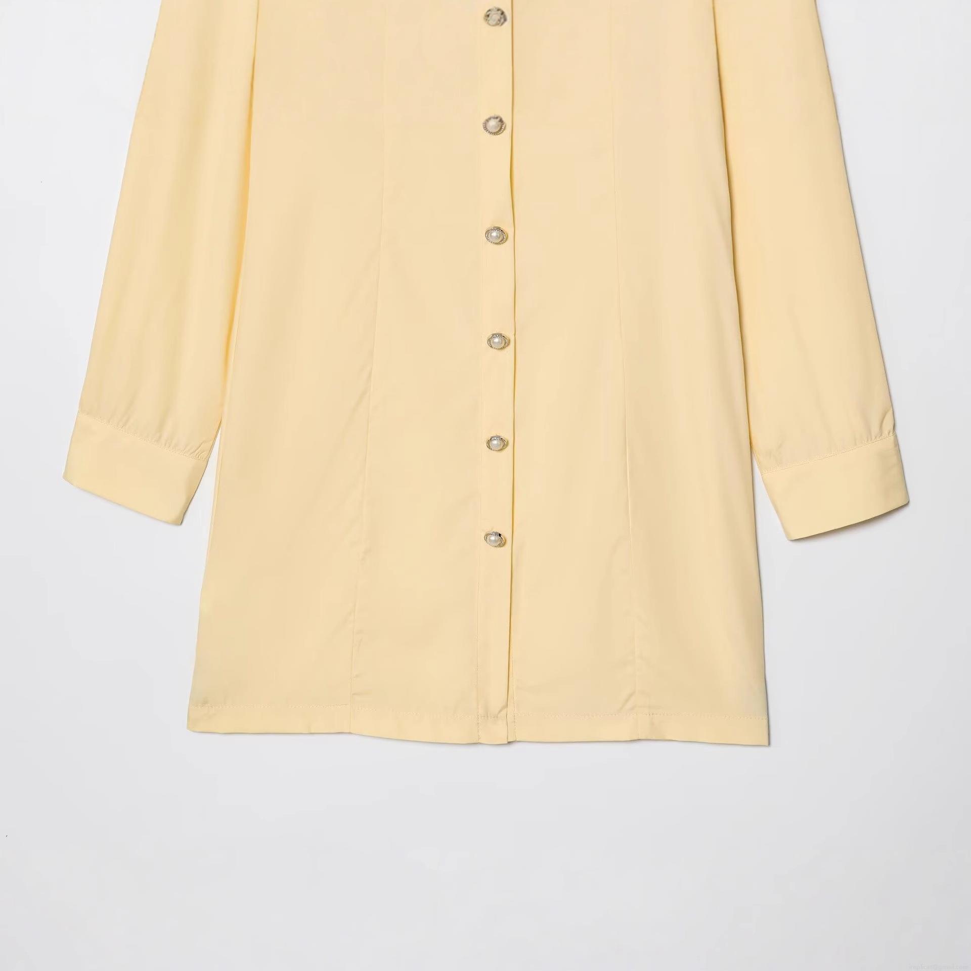 Women Elegant Long Sleeve Mini Shirt Dress Slim Fit Polyester Poplin With Pearl Buttons Casual Sweet Solid Color Dress For Daily Office Lady