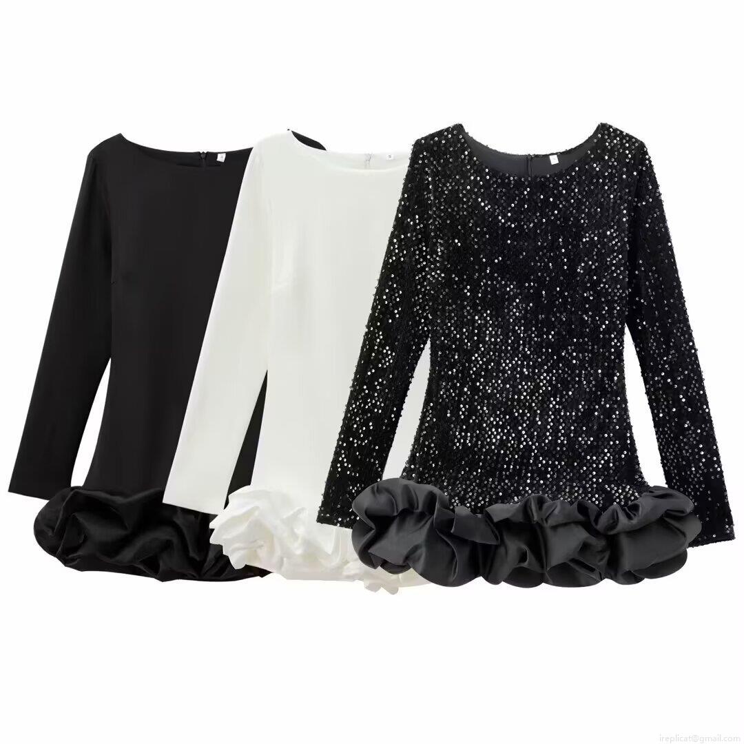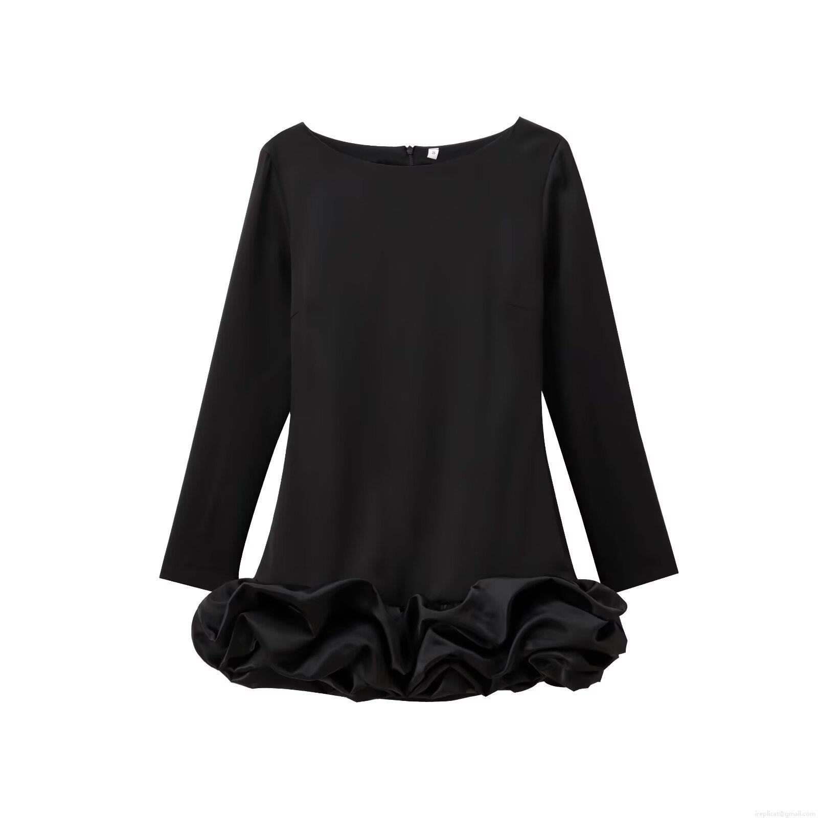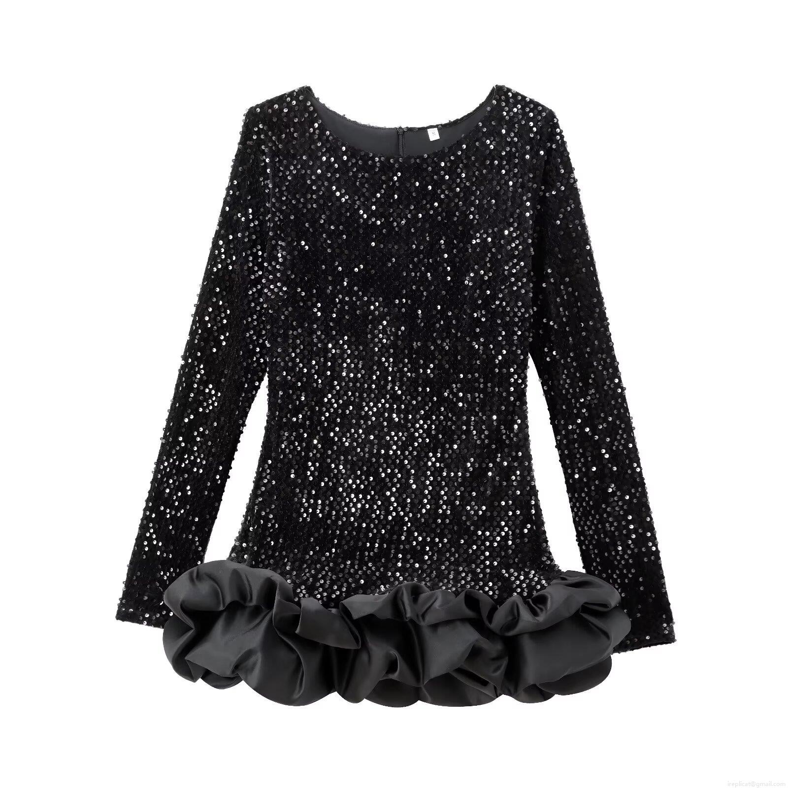 • Women Elegant Mini Dress Long Sleeve Round Neck Bubble Hem Ruffle Lotus Leaf Trim Party Dress Formal Evening Gown Sequin Solid Color Wedding Guest Dress