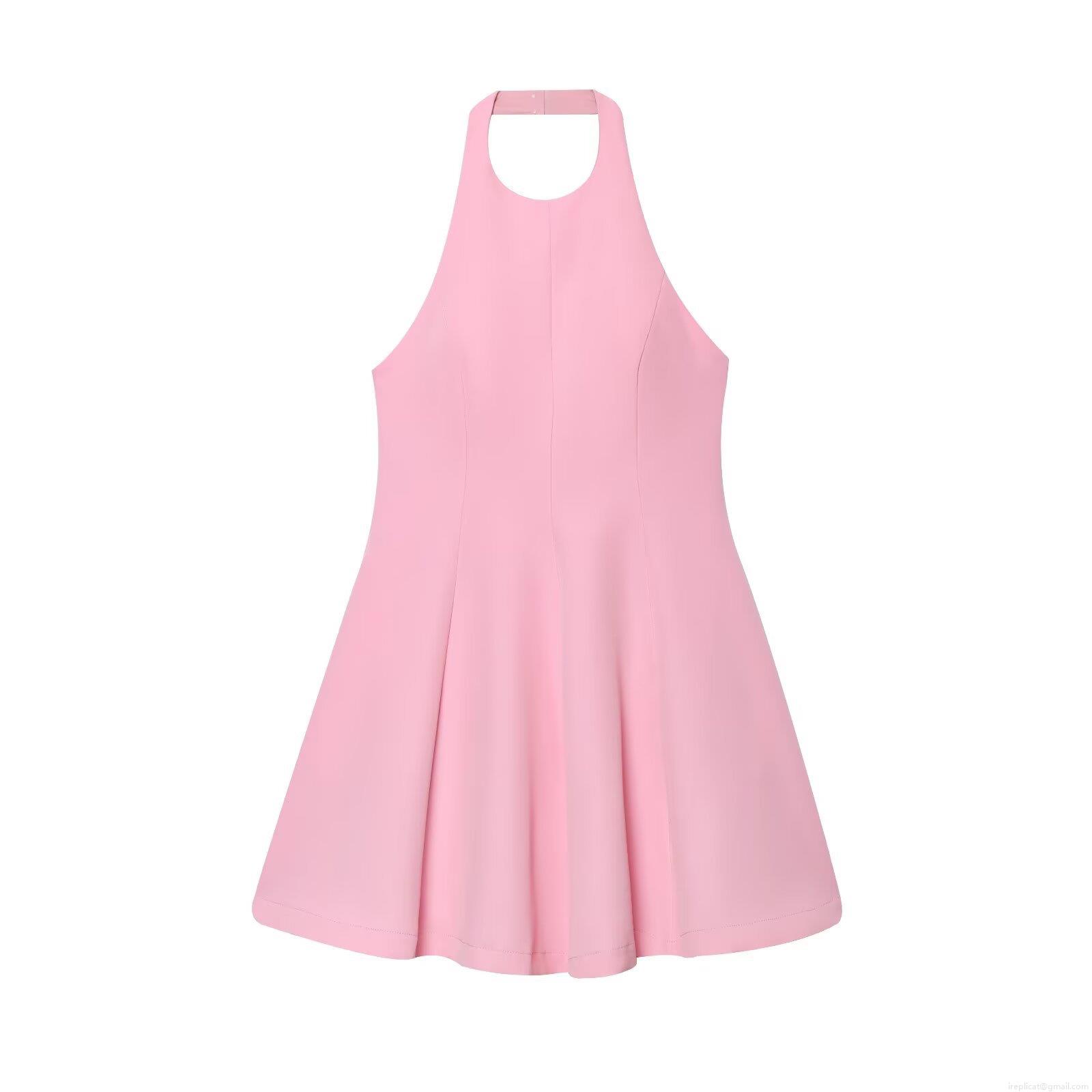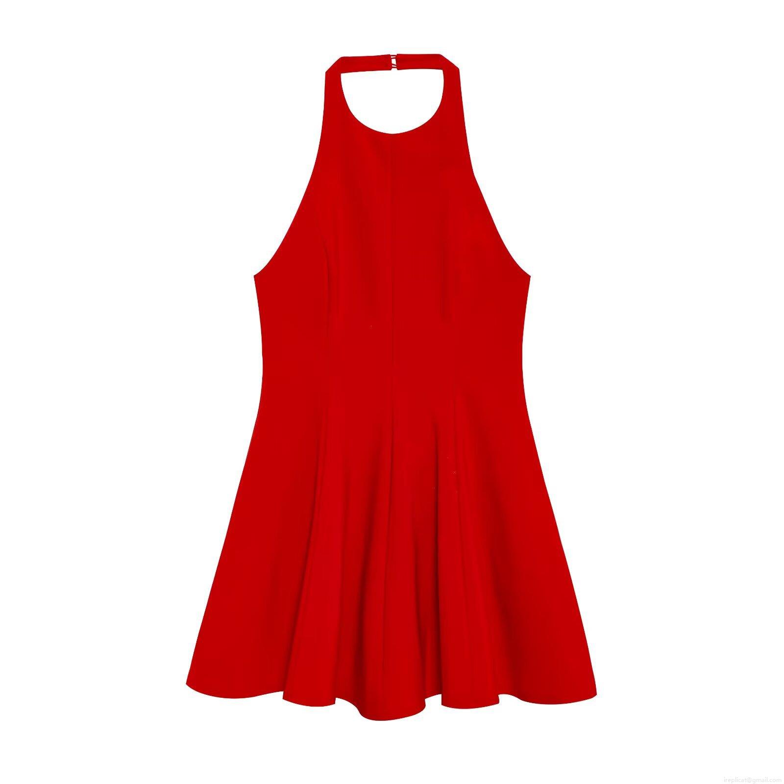 • Women Elegant Polyester Halter Neck Backless Mini Dress Sexy Solid Color Wavy Hem A-Line Sleeveless Short Party Club Dress