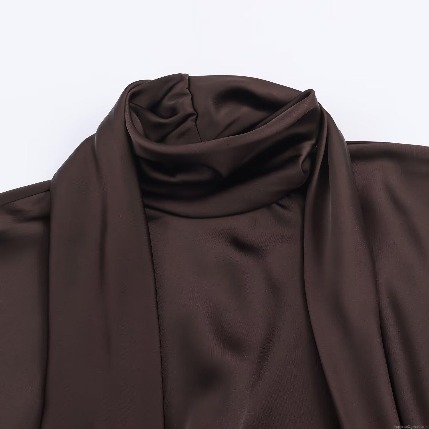 Women Elegant Satin Acetate Long Sleeve Mini Dress With Scarf Tie High Neck Chocolate Brown Silk Texture Bodycon Party Evening Wrap Dress Autumn Fashion
