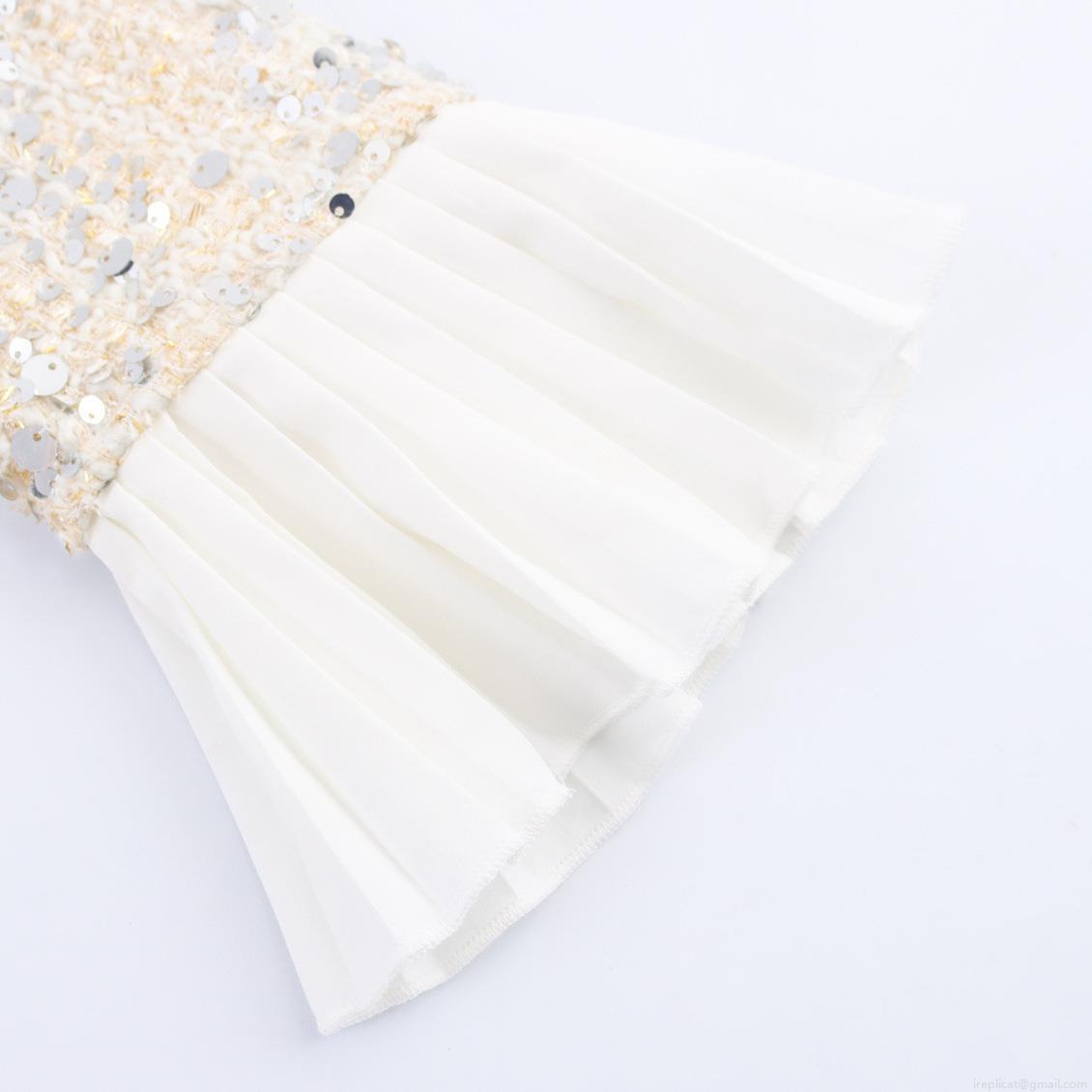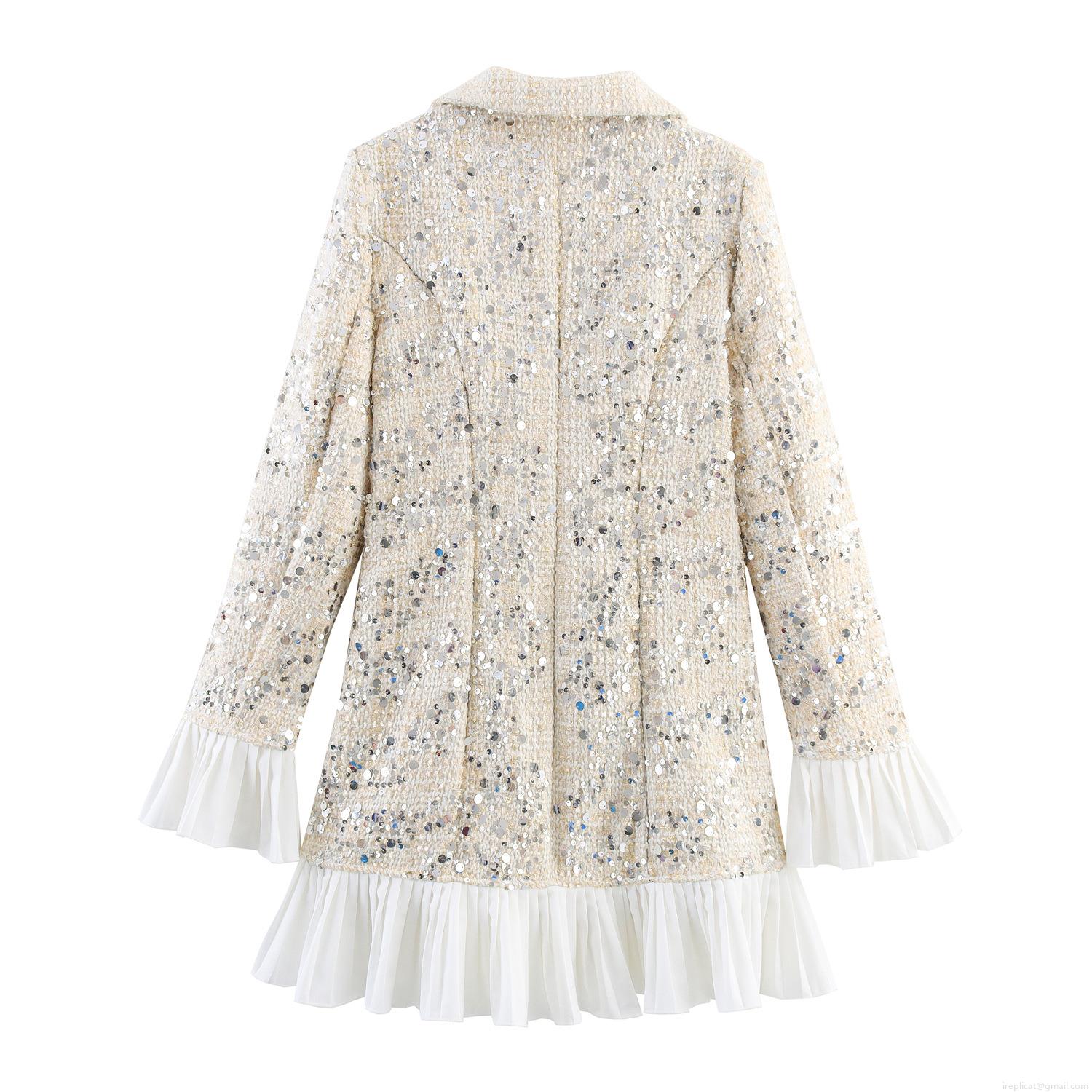 • Women Elegant Sequin Tweed Blazer Dress White Pleated Chiffon Patchwork Long Sleeve Single Breasted Socialite Style Mini Dress For Party Banquet
