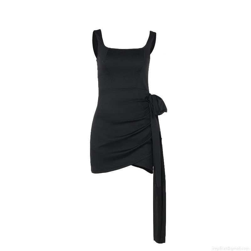 • Women Elegant Sleeveless Square Neck Bodycon Mini Dress Chic Polyester Spandex Slim Fit Dress With Side Bow Streamer Decor For Party Dating