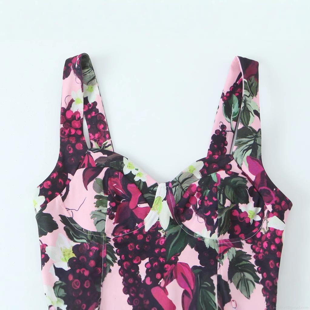 • Women Elegant Slim Fit Printed Fishtail Maxi Dress Sicilian Style Grape Pattern Heart Neck Sleeveless Camisole Polyester Bodycon Long Dress For Summer Party Wedding