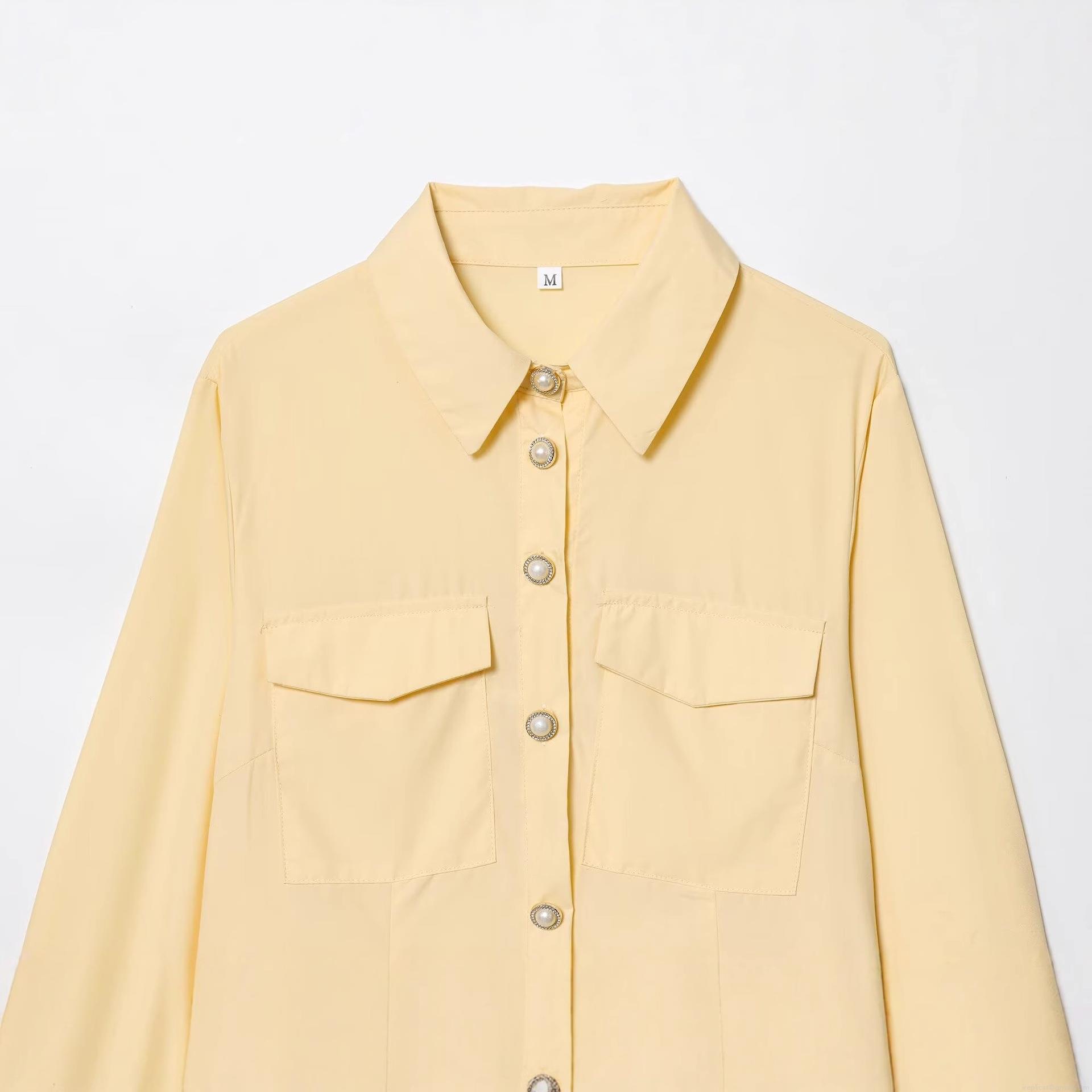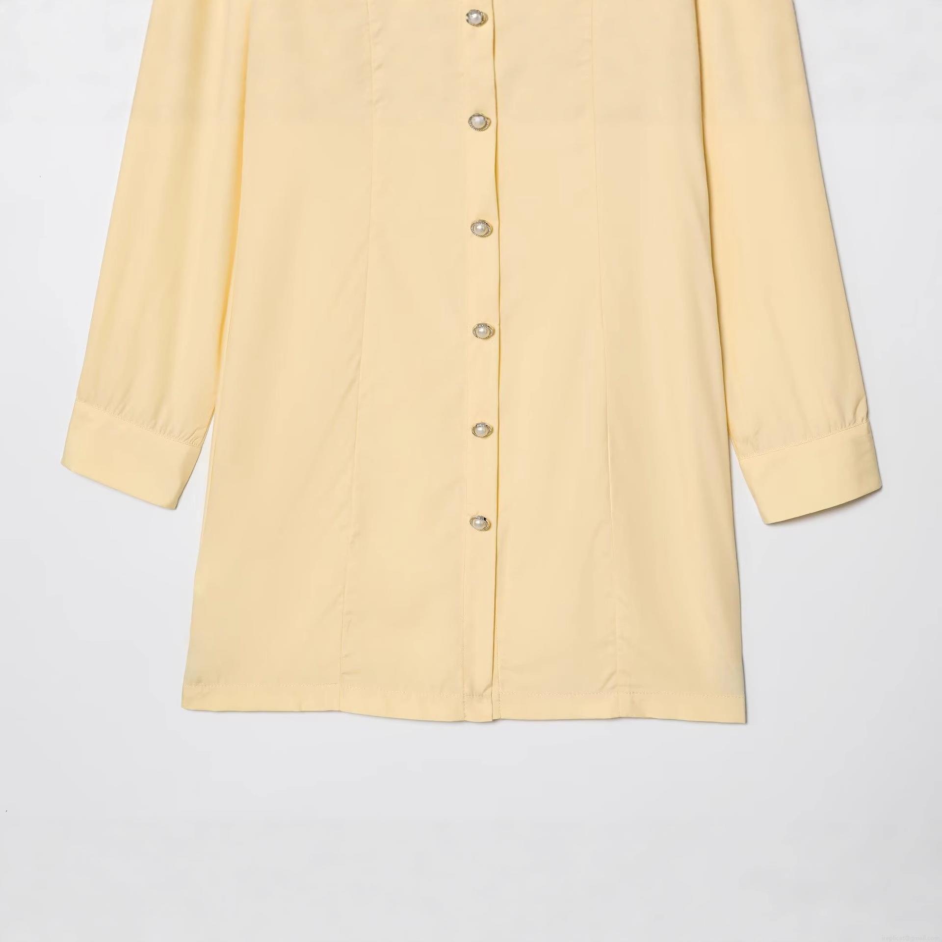• Women Elegant Solid Pale Yellow Long Sleeve Mini Shirt Dress With Pearl Buttons And Double Chest Pockets Imitation Tencel Polyester Slim Fit Dresses