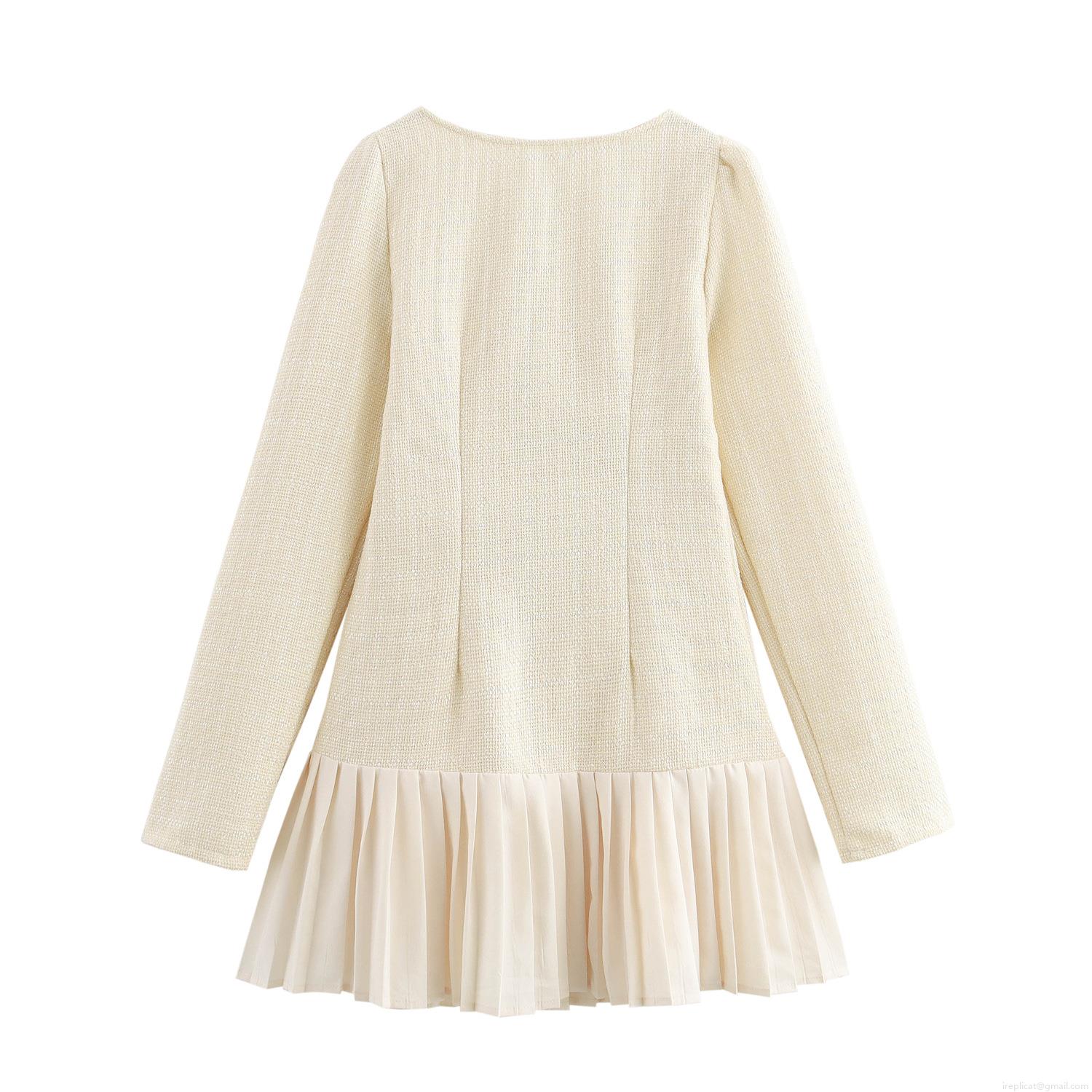 • Women Elegant Square Neck Tweed Long Sleeve Mini Dress With Pleated Hem And Gold Buttons Temperament Celebrity Style Short Dress