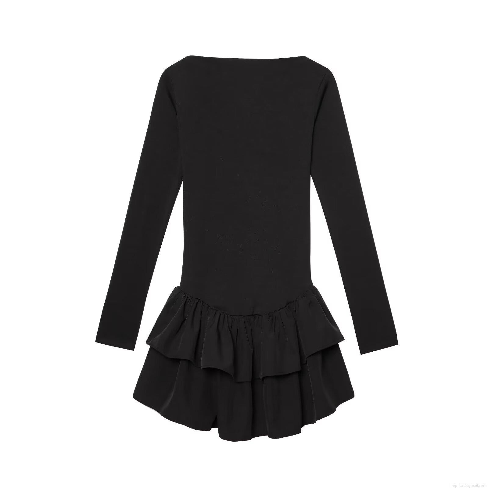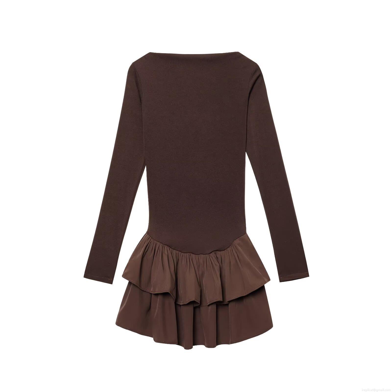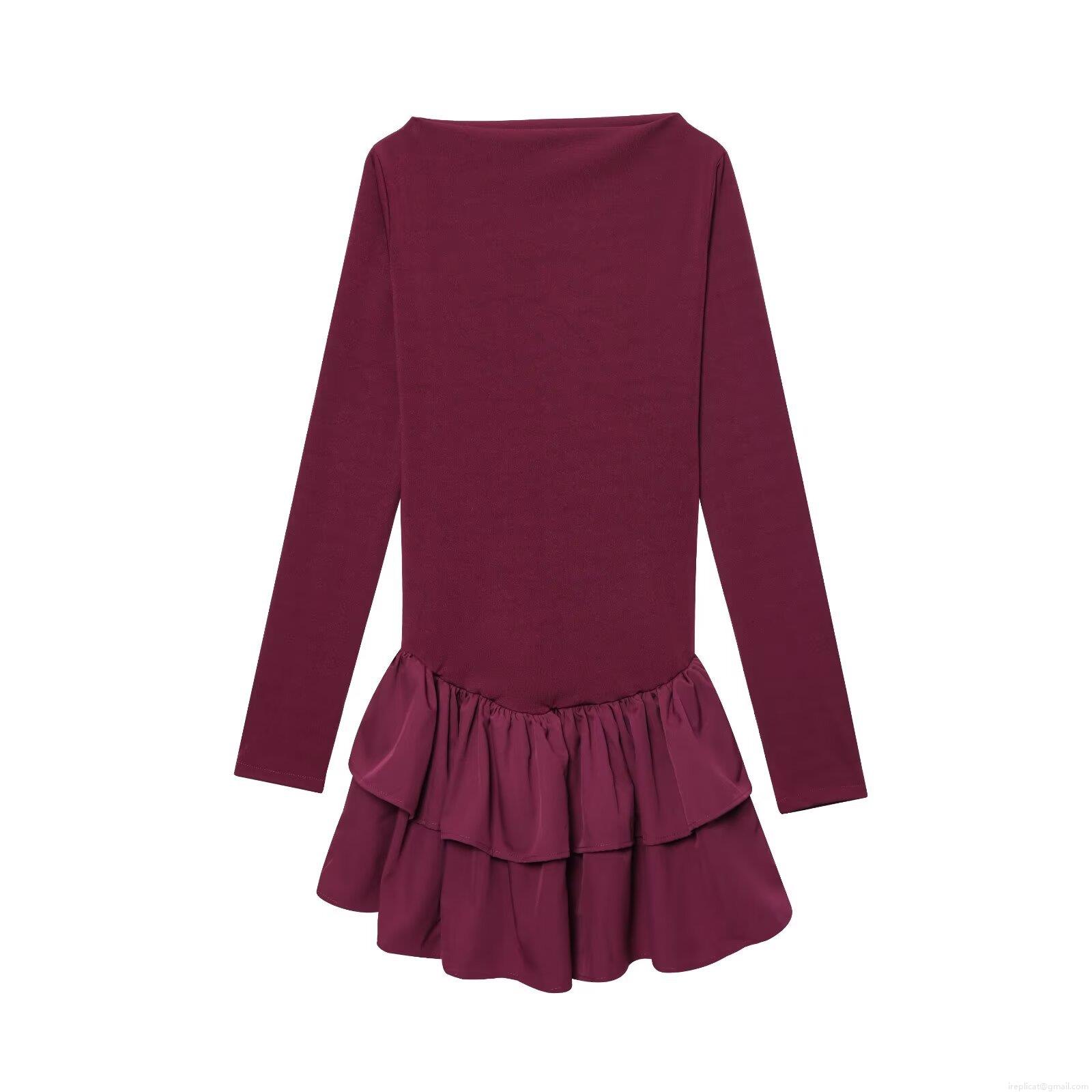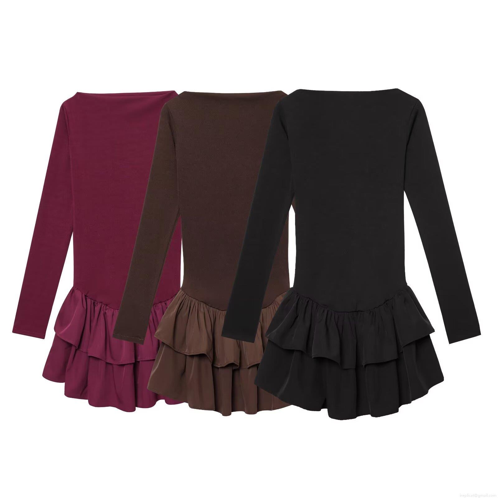 • Women Elegant Tiered Ruffle Dress Long Sleeve Boat Neck Solid Color Mini Dress Polyester Blend Slim Fit Socialite Party Clubwear Short Dress