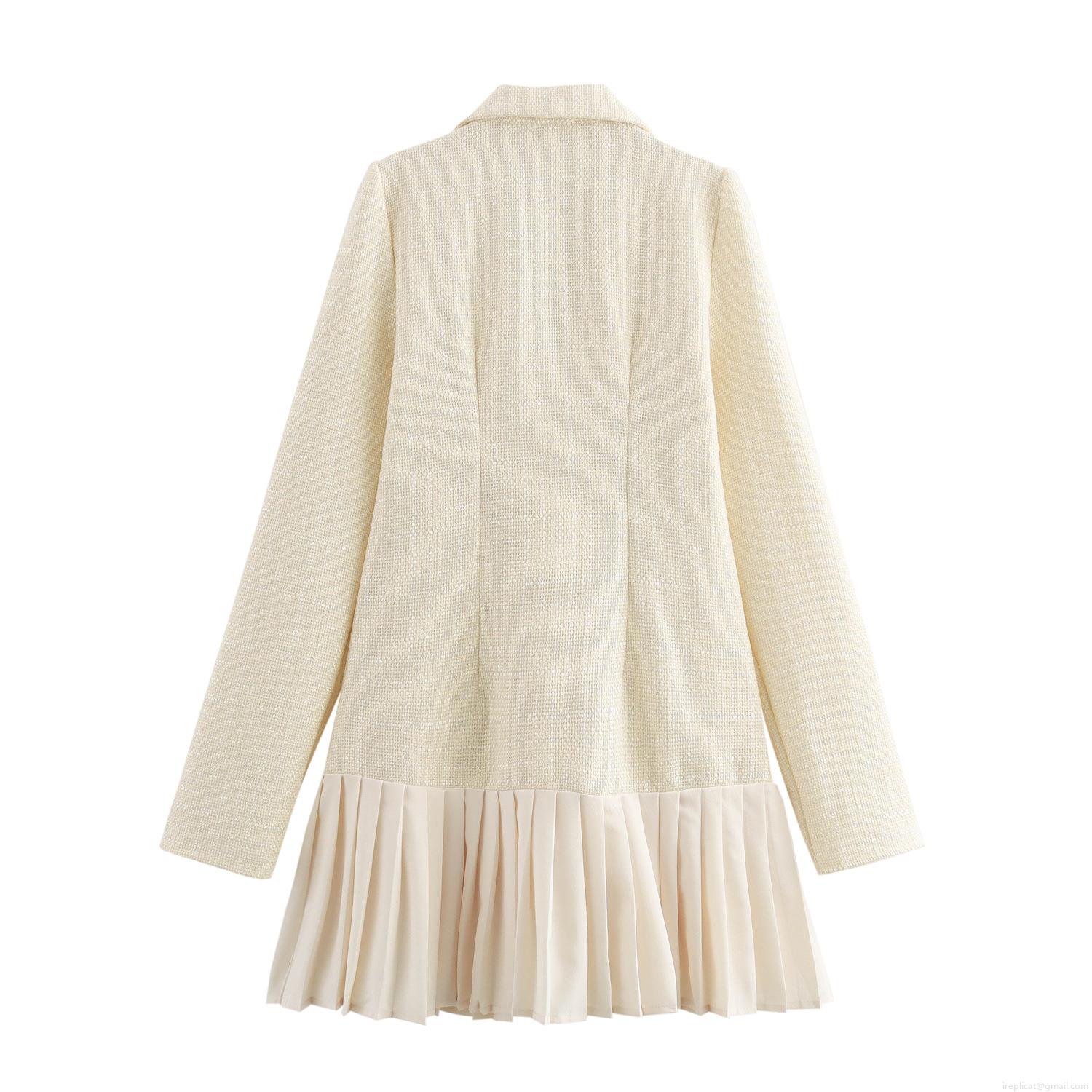 • Women Elegant Tweed Blazer Dress Long Sleeve Cinched Waist Pleated Mini Dress Gold Button Office Party Bodycon Short Dresses