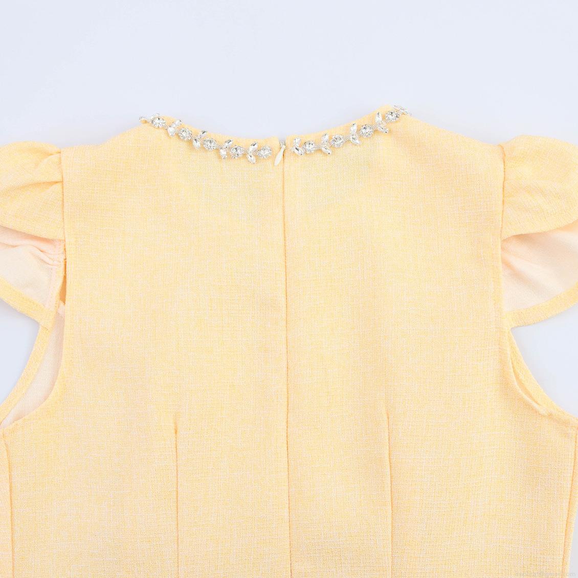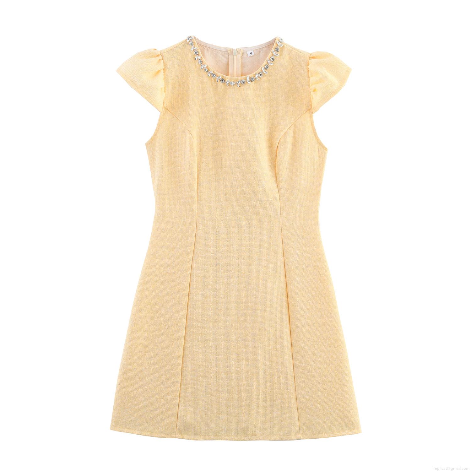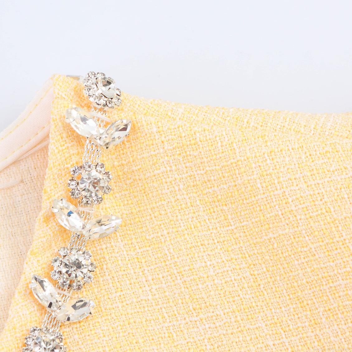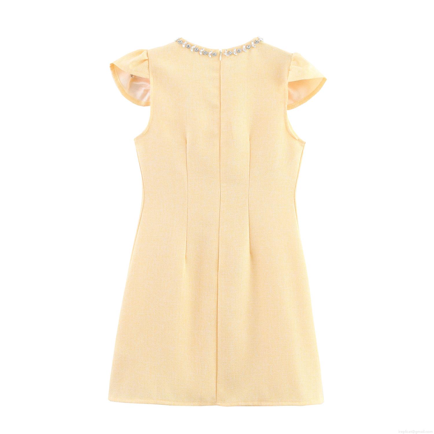 • Women Elegant Tweed Mini Dress With Rhinestone Collar Flutter Sleeves High Waist A-Line Short Dress For Summer Socialite Party