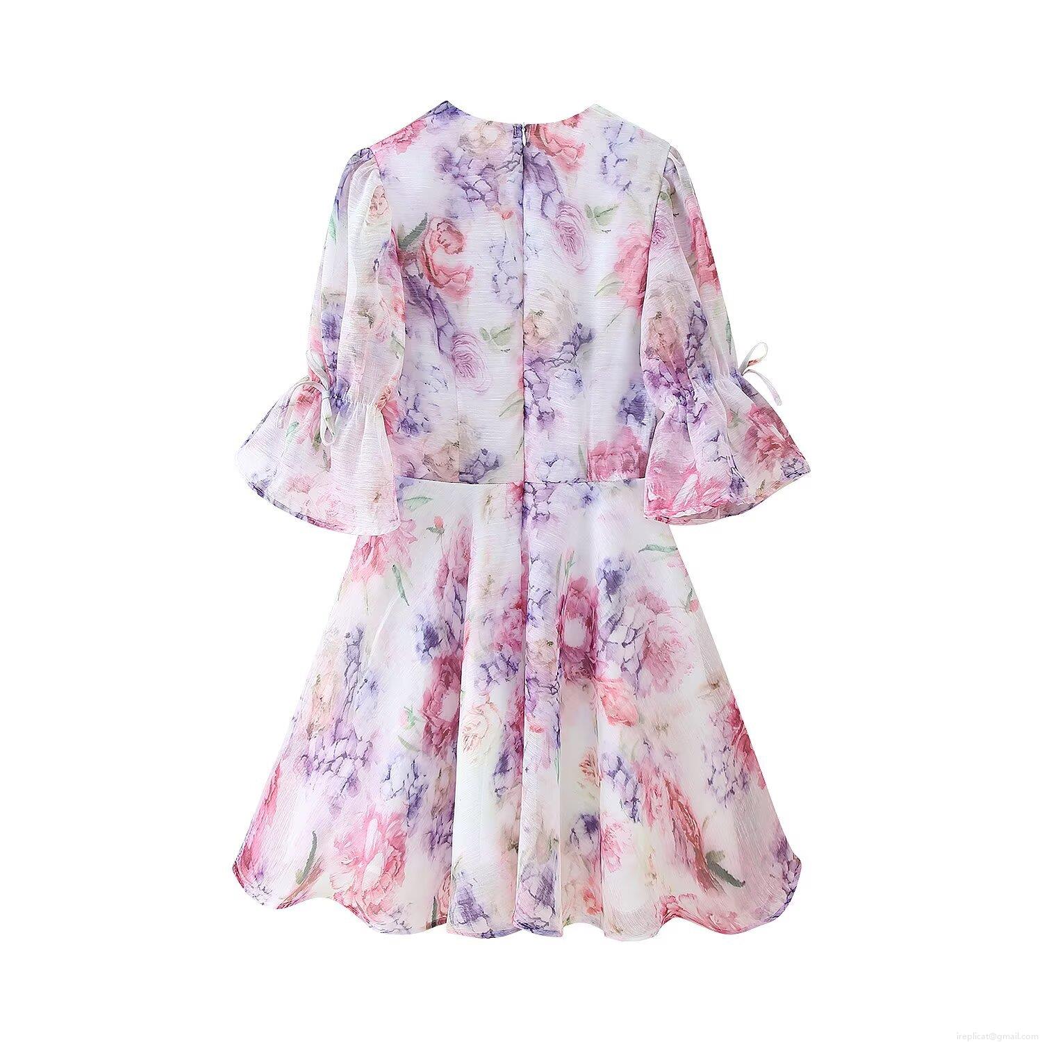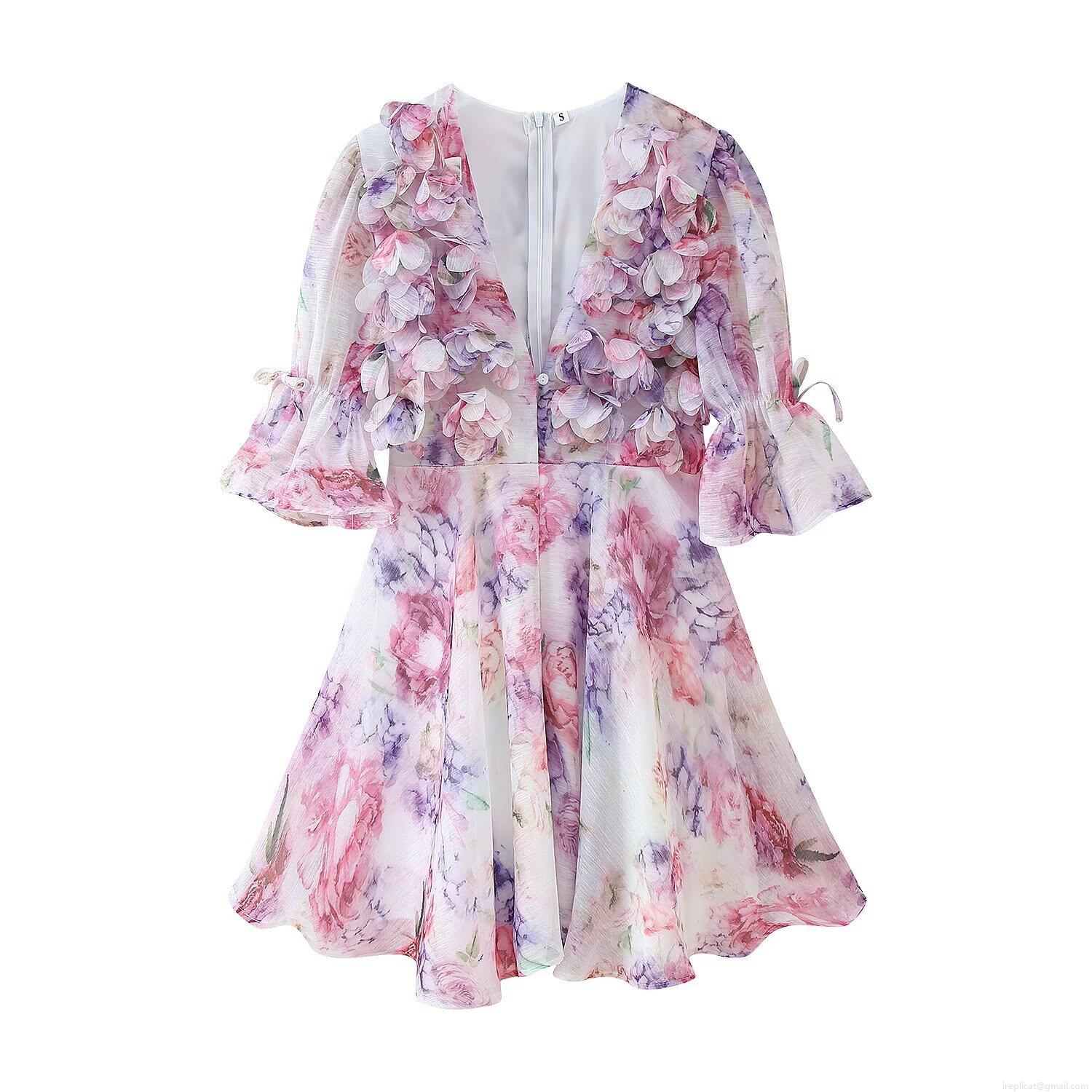 • Women Elegant V Neck 3D Floral Applique Chiffon Mini Dress Pink Purple Flower Print Puff Sleeve Short Party Dresses With Lining For Lady Summer Vacation