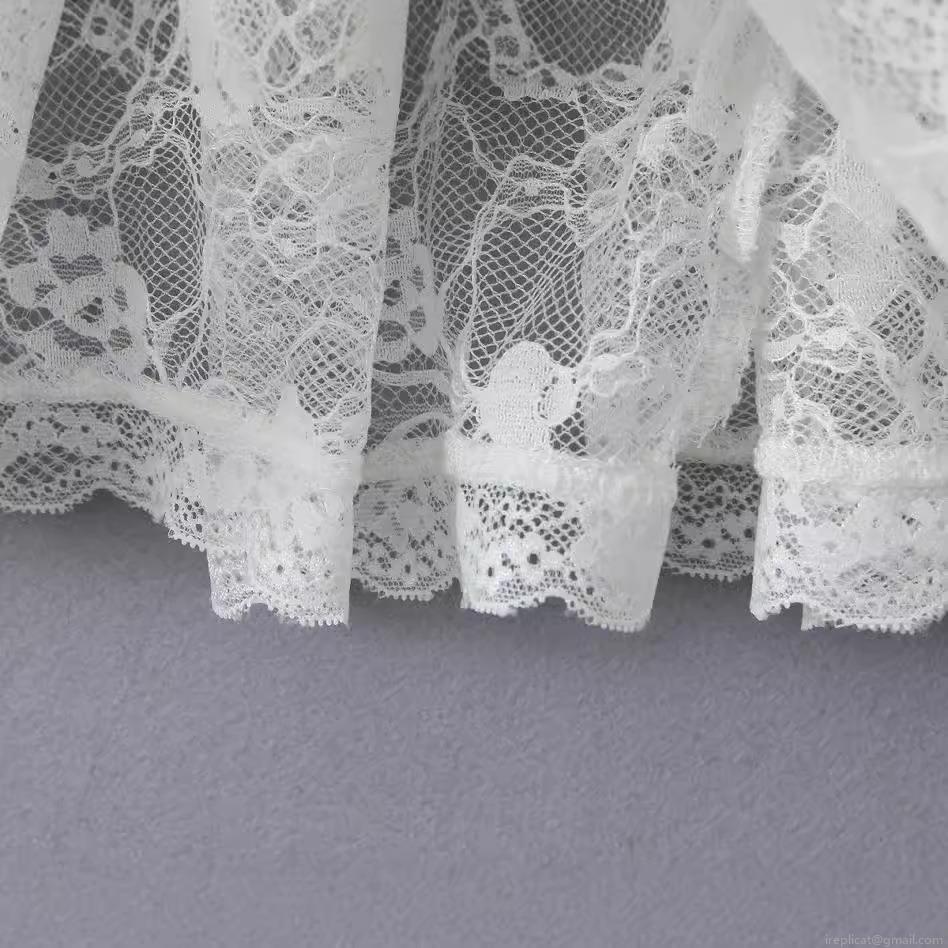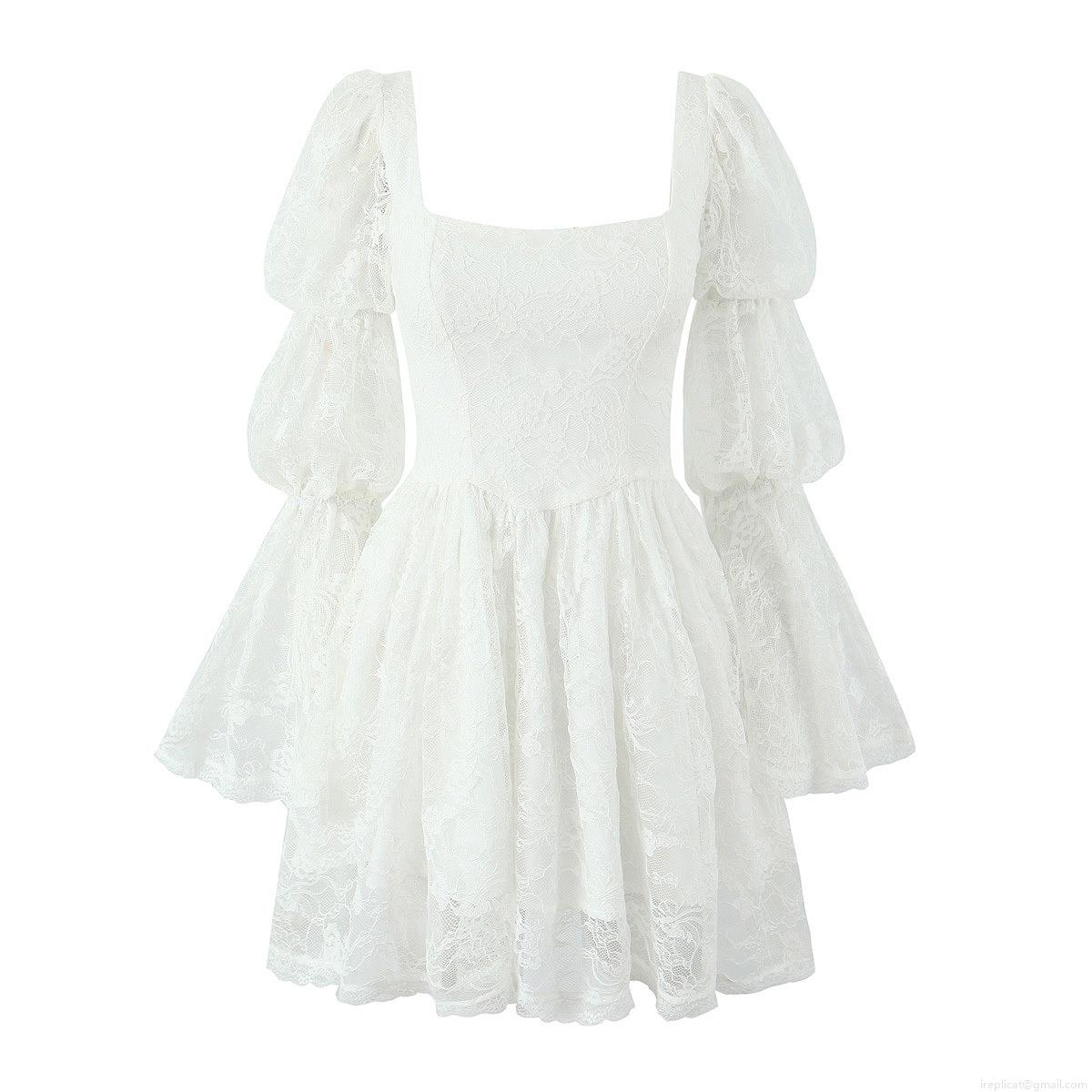 • Women Elegant White Lace Mini Dress Square Neck Puff Long Sleeve High Waist A-Line Floral Embroidery Sexy French Style Party Short Dress