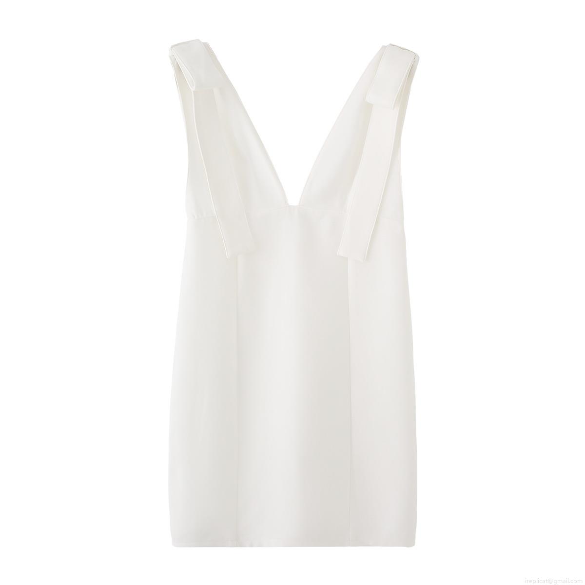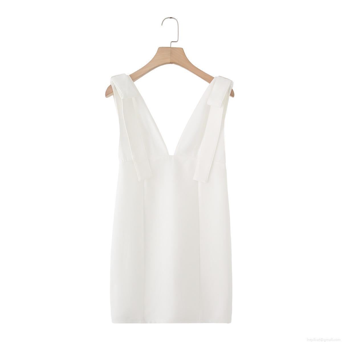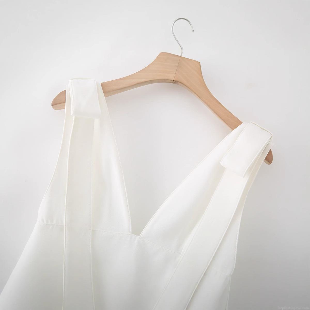 • Women Elegant White V-Neck Sleeveless Bow Mini Dress With Back Zipper Solid Color Polyester Short Dress For Party Dating Ladies Clothing